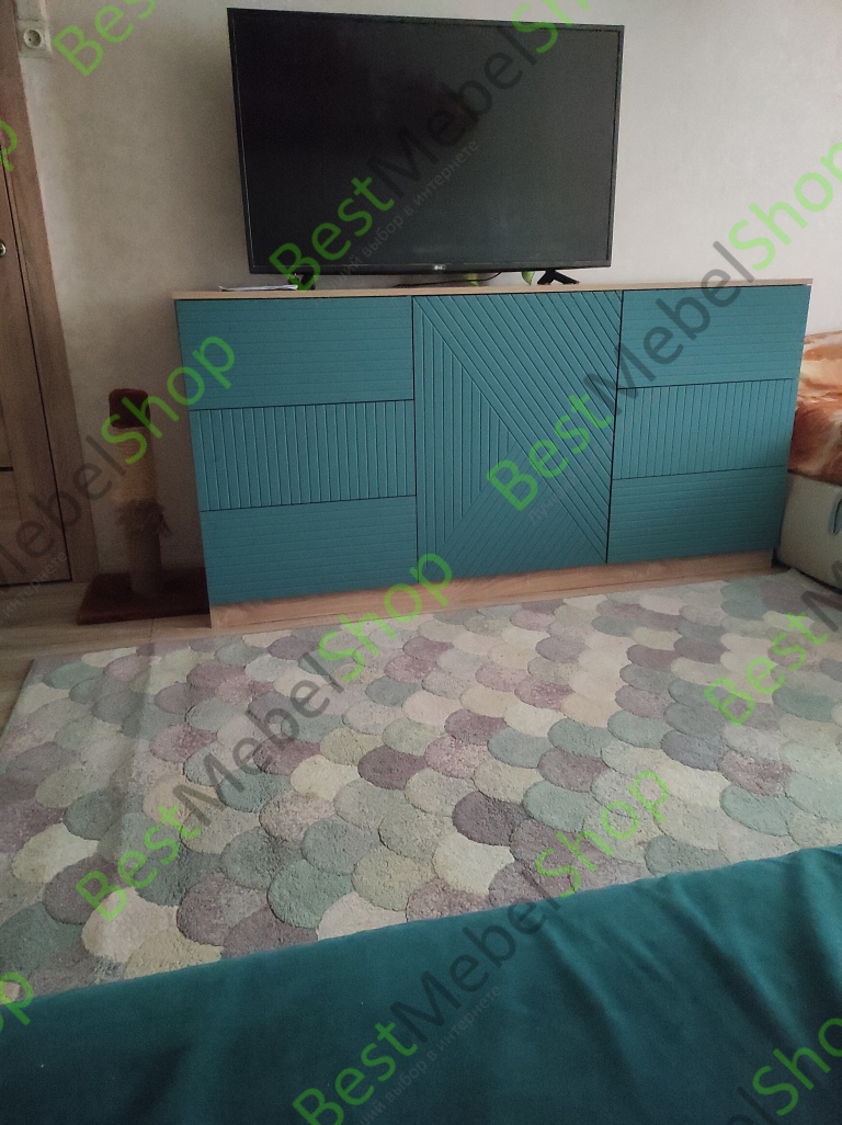 Комод очень понравился. Искали максимально длинный комод, во всю стену и чтобы подошел к интерьеру. Заменили одну полку в центральном отделении на три (добавили две дополнительные). Удобно, что у модели есть ножки и можно выбрать их высоту, чтобы прошел робот-пылесос. Сделан качественно, хорошие материалы, фрезировка фасадов выглядит отлично. Заказ 00000183333