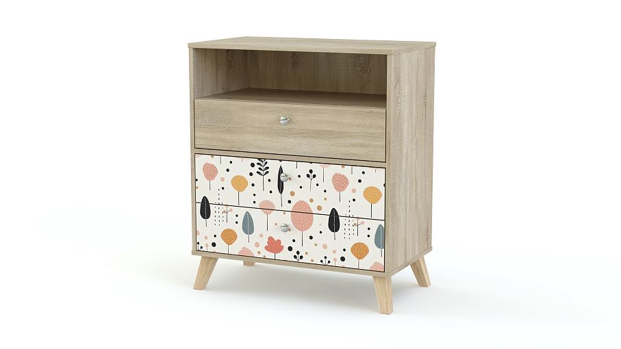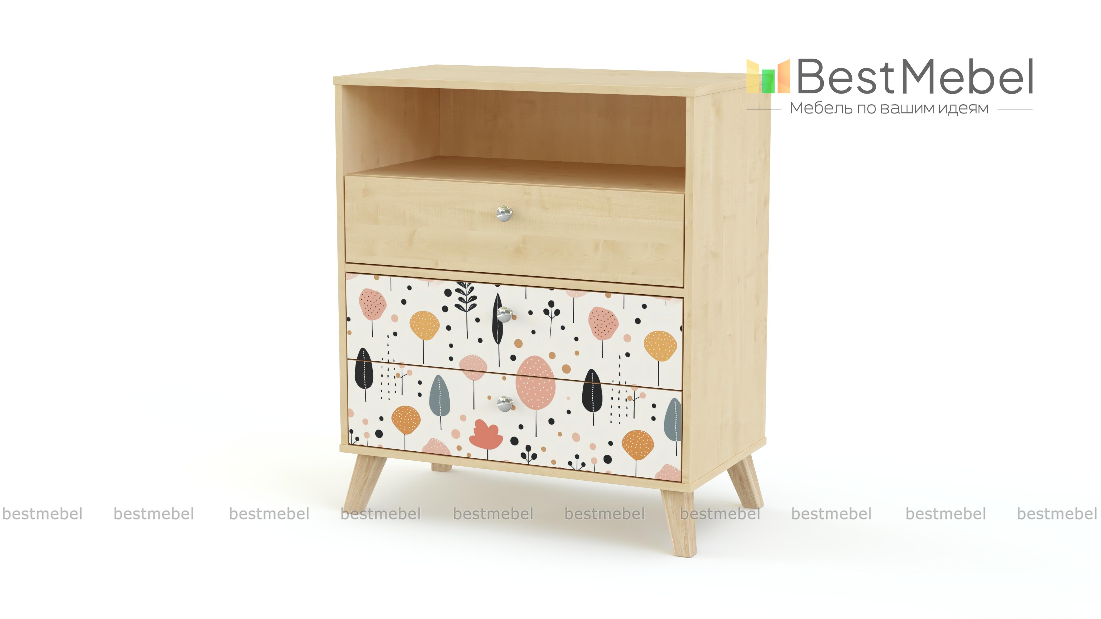Комод Эльза 3 BMS незаменим для хранения мелкого трикотажа, канцелярских принадлежностей, наборов для творчества и игрушек. В нише удобно хранить то, что необходимо под рукой, а все остальное уместится в три выдвижных ящика. Необыкновенно комфортный дизайн создает комбинация природной фактуры и пастельного принта в технике фотопечати. Купить комод Эльза 3 BMS с индивидуальным подбором размеров, цвета и фурнитуры вы сможете недорого в нашем интернет-магазине.