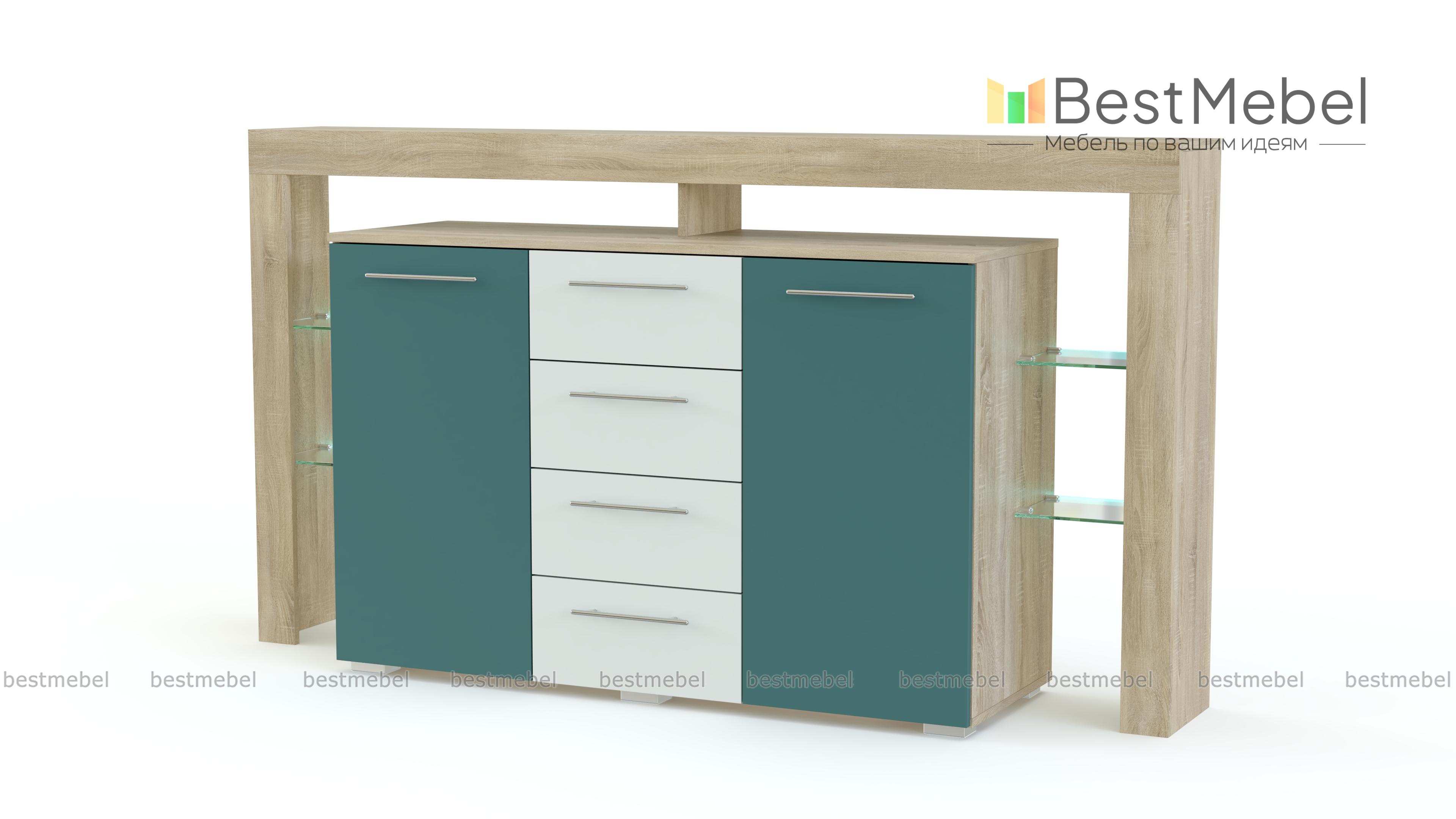 Футуристичный дизайн комода Riva II plus BMS станет идеальным дополнением современных интерьеров в стиле хай-тэк и минимализм. Четыре выдвижных ящика в центре располагаются по соседству с вместительными распашными отделениями и необычными, полностью открытыми стеклянными полками. Матовые фасады выполнены в контрастных цветах, фурнитура удобная и лаконичная, а светодиодное освещение придаст атмосферности не только предметам декора, но и гостиной в целом. Расцветку корпуса и фасадов вы сможете подобрать в нашем интернет-магазине.