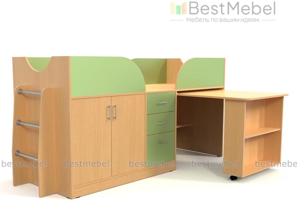 Детская кровать-чердак Дет41 BMS – оптимальное приобретение, если нужно получить практичную модель. Она сэкономит место в маленькой спальне. Постель расположена наверху, оснащена бортами. Попасть в нее можно по лестнице с хромированными ступенями-трубами. Нижняя часть представляет систему хранения: шкаф с двумя дверцами (внутри полка), комод с 3-мя ящиками выдвижного типа. Учиться или заниматься творчеством ребенок сможет за столом, лицевая часть оснащена полками. Отличная возможность аккуратно расставить книги, учебники! Элемент выдвигается из-под основания кровати. Цветовая гамма ЛДСП представлена в вариантах, подходящих для мальчика или девочки.
