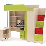 Детская кровать-чердак Мерабель BMS – отличная модель с потрясающей функциональностью. В комплект входят все элементы, необходимые для гармоничного развития малыша. Большой шкаф интересной формы вместит кучу детских вещей. На спальное место, скрытое за фигурной панелью, нужно забираться по надежной лестнице – тумбе. Её вместительные ступени станут домом для многочисленных игрушек и прочих детских богатств. Рабочий стол имеет полный арсенал для полноценного учебного процесса: это и полочки для книг, и тумба с ящиками для тетрадок и канцелярских мелочей. Обратите внимание на пристройку к столу, которая легко крутится на никелированной опоре, при необходимости увеличивая рабочую поверхность стола почти вдвое. Ребенок с удовольствием будет раскладывать свои вещи по полочкам, поддерживая порядок в своем собственном мирке. Купить детскую кровать – чердак Мерабель BMS по минимальной цене можно на нашем сайте.