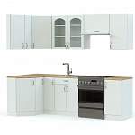 Небольшая элегантная кухня Классика BMS – это сочетание классического дизайна и современных тенденций. Широкая гамма оттенков позволит подобрать оптимальные для вашего интерьера и легко вписать стильный угловой комплект в помещение. Фасады, выполненные из прочных, влагостойких материалов, декорированы фрезеровкой, дверцы посудного шкафа застеклены. Комплект из пяти нижних и шести навесных модулей позволит держать под рукой все необходимое.