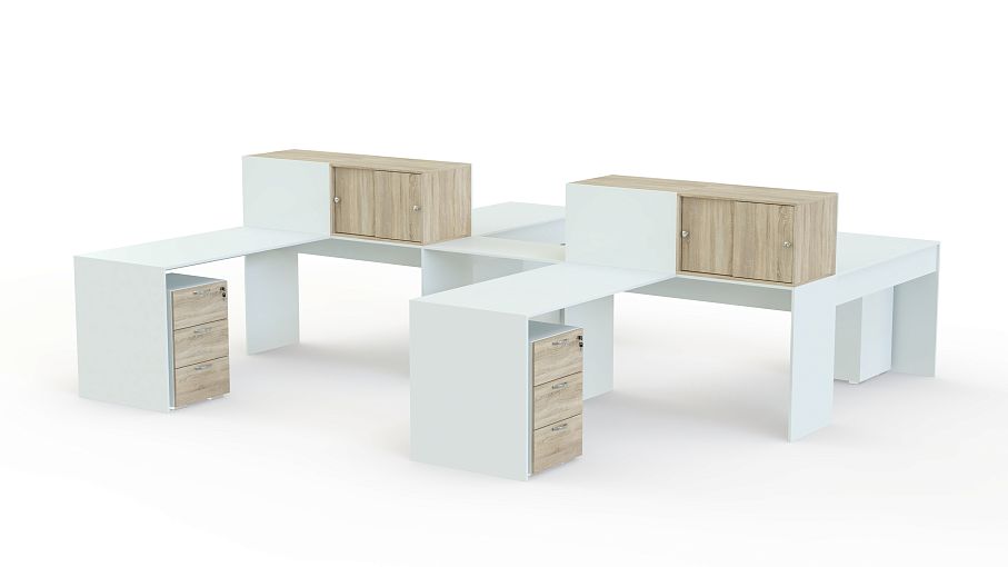Бенч-система Альма 3 BMS отличается крупными габаритами, но при этом визуальной легкостью и гармонично впишется в просторные офисы типа опен спейс. Многофункциональная композиция включает в себя четыре компьютерных стола, дополненных мобильными тумбами с выдвижными ящиками. Зонировать рабочие места помогут расположенные по центру полки для документов с раздвижными дверцами. Купить бенч-систему Альма 3 BMS, выполненную в сочетании белого и цветных вставок, приглашаем в наш интернет-магазин.