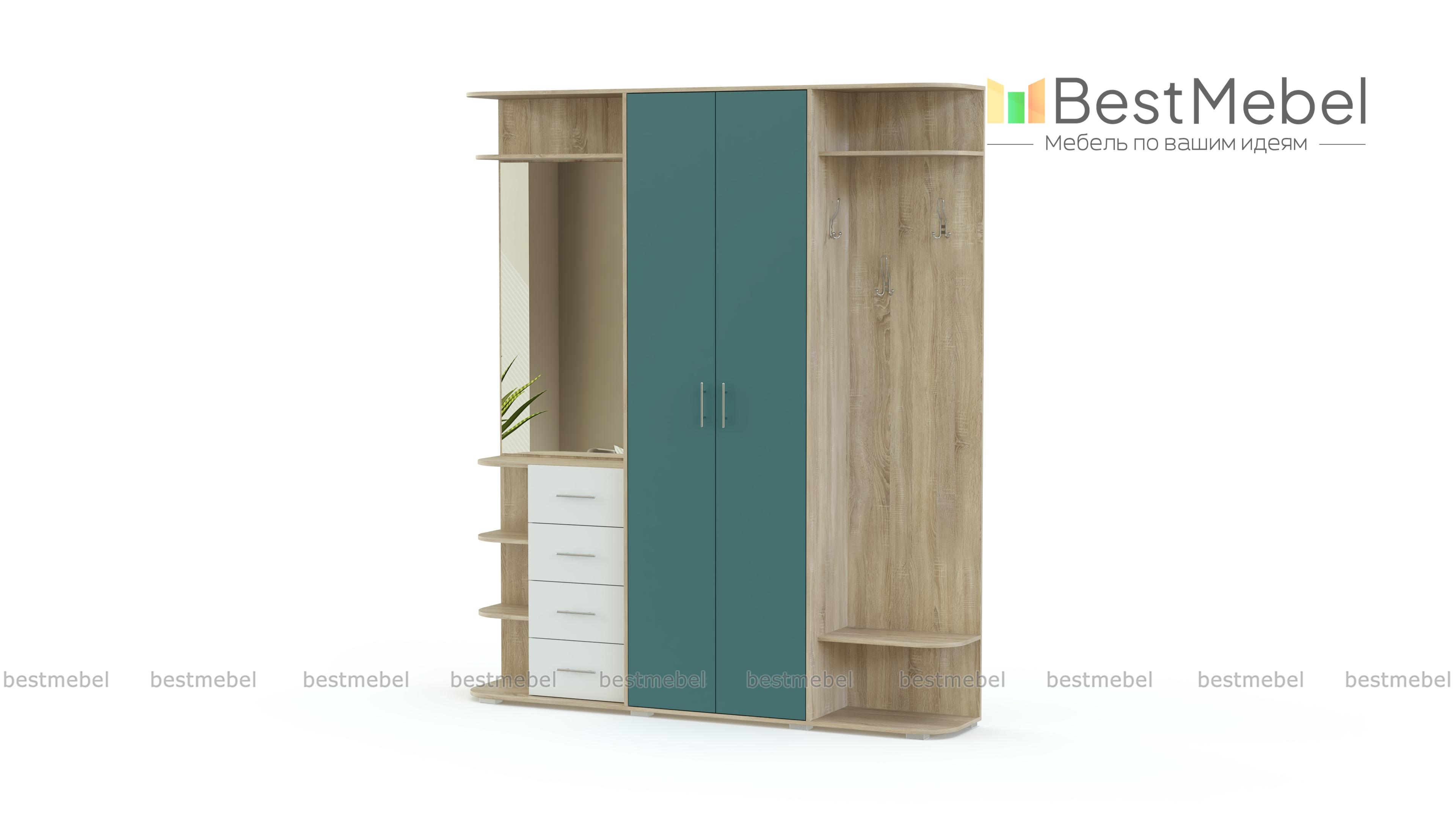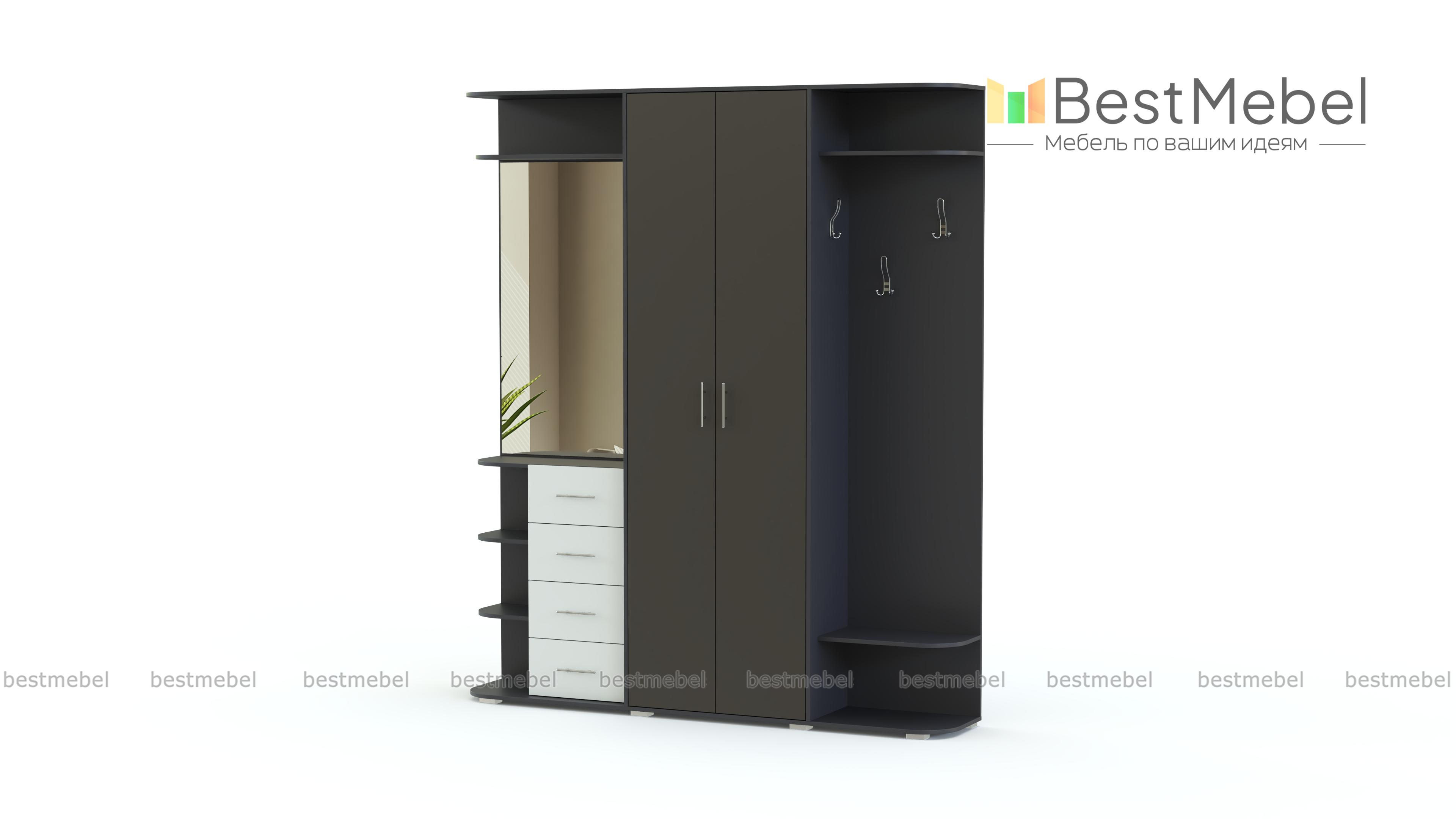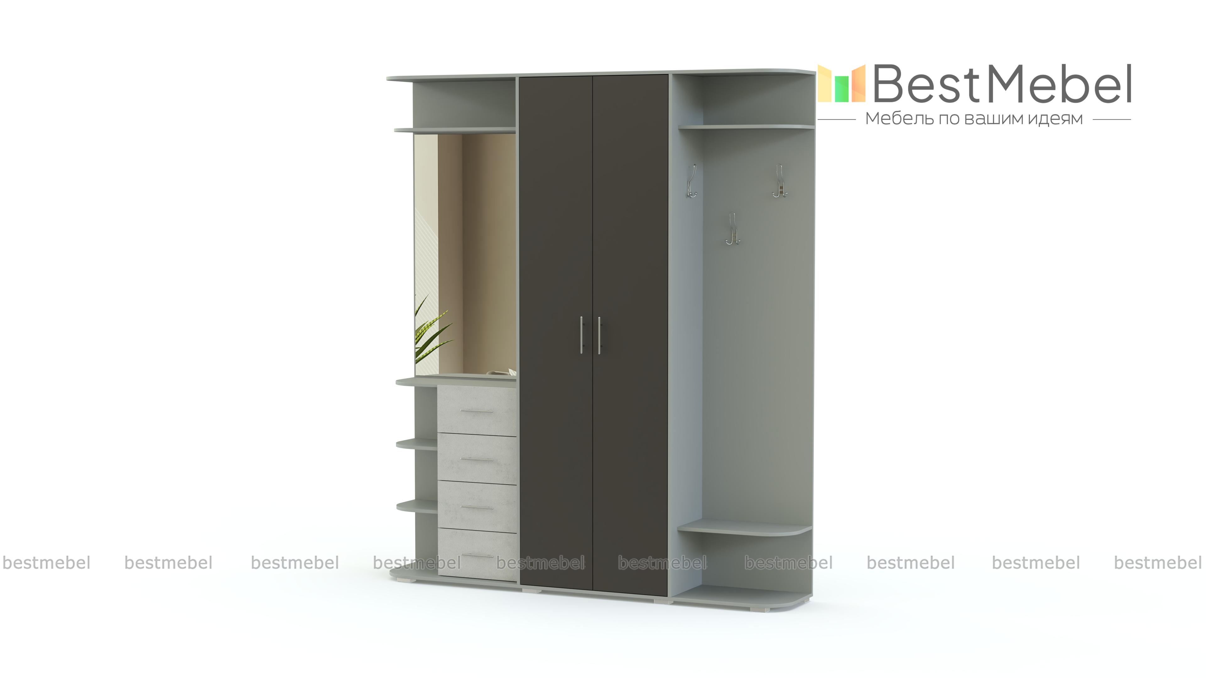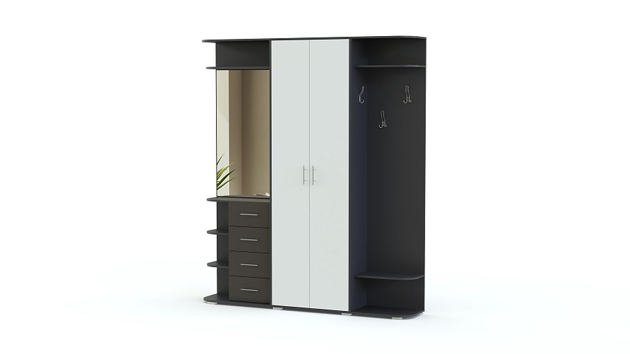 Стенка-прихожая «Идеал 6» BMS – элегантная стенка в модной серо-белой гамме. Прямая модель легко впишется в обстановку и позволит разместить множество вещей – от предметов гардероба до украшений и парфюма. В комплекте распашной платяной шкаф и боковые секции – с крючками и тумбой с зеркалом. Фасады дверей и выдвижных ящиков матовые, с практичными ручками-рейлингами. Закругленные углы открытых полок придают модели законченный, стильный вид. Купить стенку-прихожую «Идеал 6» BMS приглашаем к нам в интернет-магазин.
