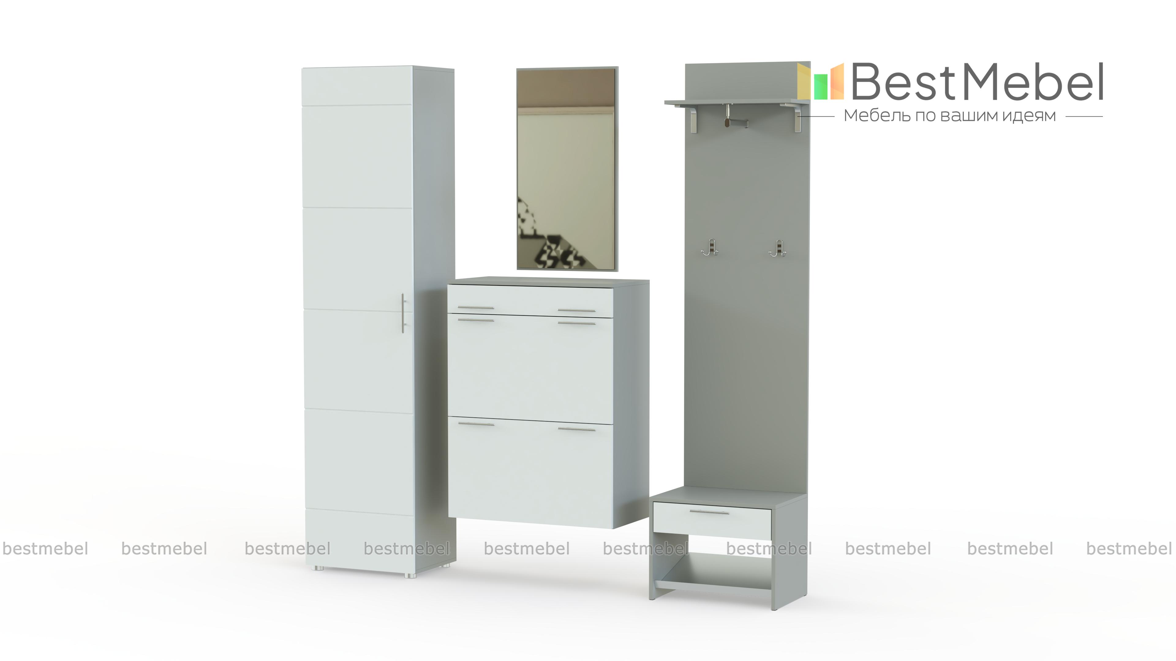 Гарнитур для прихожей состоящий из пяти частей не только вместительный, но и прекрасный конструктор для создания индивидуального интерьера. Каждая часть независима от других, можно менять местами оставив в понравившемся порядке, в зависимости от свободного пространства можно регулировать компактность конструкции.
