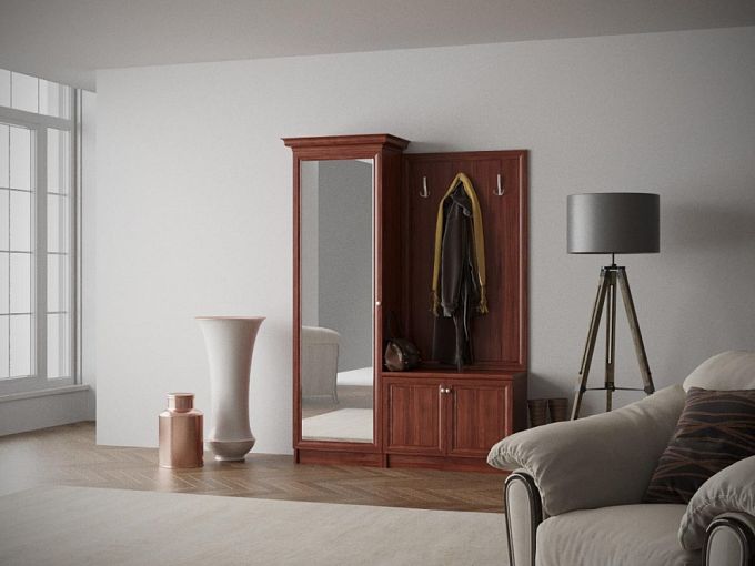Прихожая Кора-1 BMS с фрезерованными рамочными фасадами и карнизом выполнена в классическом стиле. Элегантная композиция в древесных тонах включает в себя платяной шкаф-пенал, вместительную распашную обувницу и панно с крючками для повседневной одежды. Благодаря полностью зеркальному фасаду шкафа вы сможете видеть себя в полный рост и с комфортом выбирать одежду. Купить прихожую Кора-1 BMS приглашаем в наш интернет-магазин с выбором фурнитуры и цвета по каталогу.