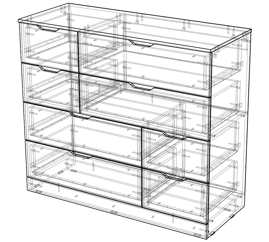 Комод Нордли Nordli 4 с асимметричным расположением ящиков воплощает современные дизайнерские тренды. Выдвижные ящики разных размеров – четыре больших и четыре малых, позволяют разместить как всевозможные мелочи, так и более габаритные вещи. Трапециевидные ручки-вырезы на светлых гладких фасадах необычно выглядят и комфортны в повседневной эксплуатации.