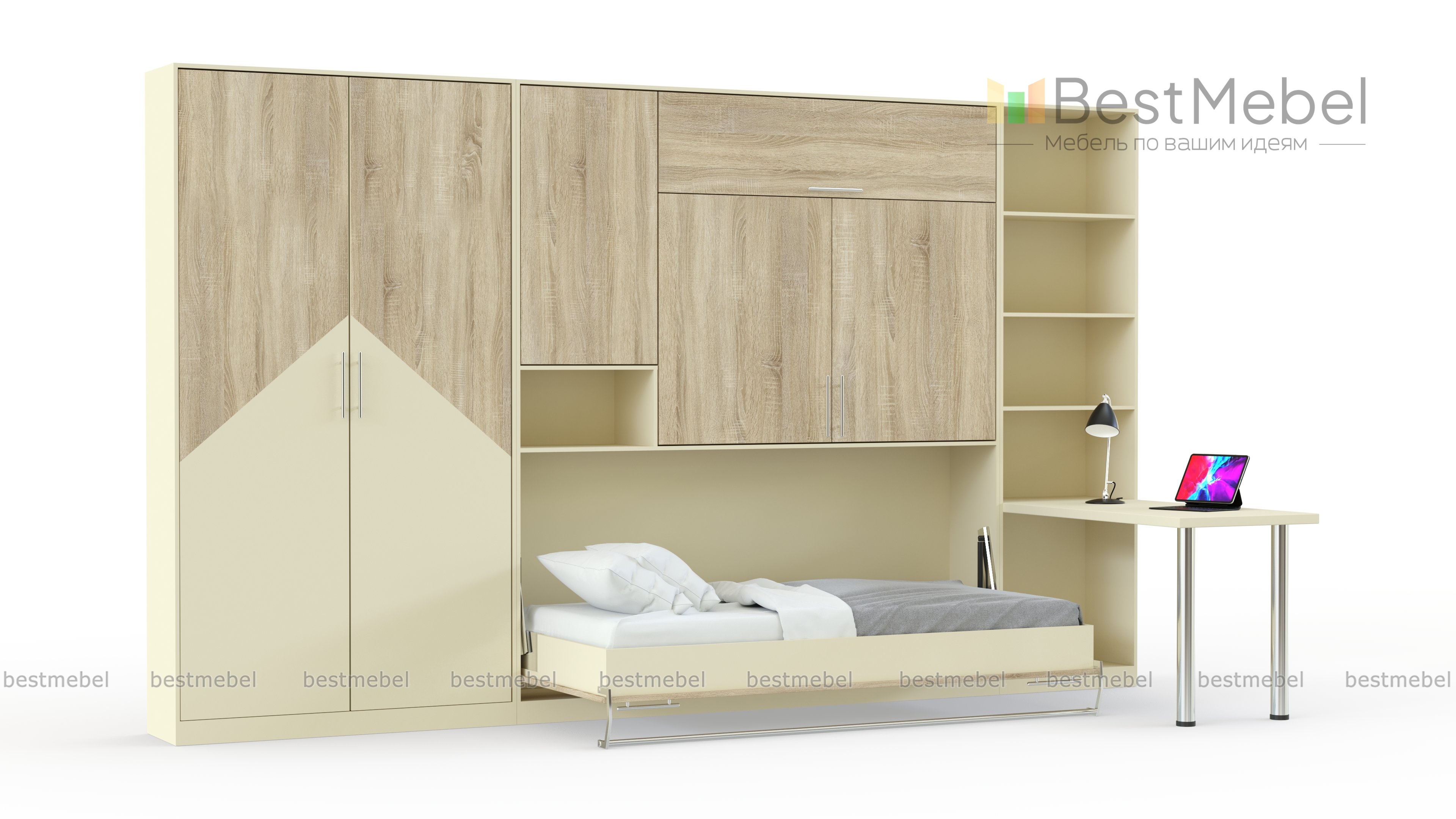 Шкаф-кровать трансформер Бранч BMS позволит создать по-настоящему комфортный и эргономичный интерьер в скандинавском стиле. Практичное решение для молодежной комнаты, П-образная композиция сможет выгодно использовать особенности планировки. Удобная система хранения представлена шкафами для белья и одежды, книжными полками и распашными секциями, для учебы предусмотрен приставной стол, а горизонтальный модуль-трансформер легко превращается в полноценную кровать. Купить шкаф-кровать трансформер Бранч BMS приглашаем к нам в интернет-магазин.