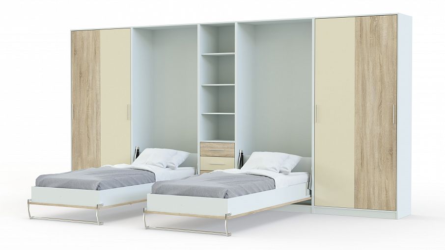 Шкаф-кровать трансформер Клеопатра BMS – оригинальное решение для комнаты двоих детей, которое по достоинству оценят маленькие владельцы и их родители. Практичный трансформер объединил две откидных кровати, замаскированные под шкафы, платяной шкаф и книжный стеллаж с выдвижными ящиками в основании. В сложенном виде композиция не отличается от привычной стенки и экономит полезную площадь детской для игр. Купить шкаф-кровать трансформер Клеопатра BMS и создать яркий и функциональный интерьер вам поможет наш интернет-магазин.
