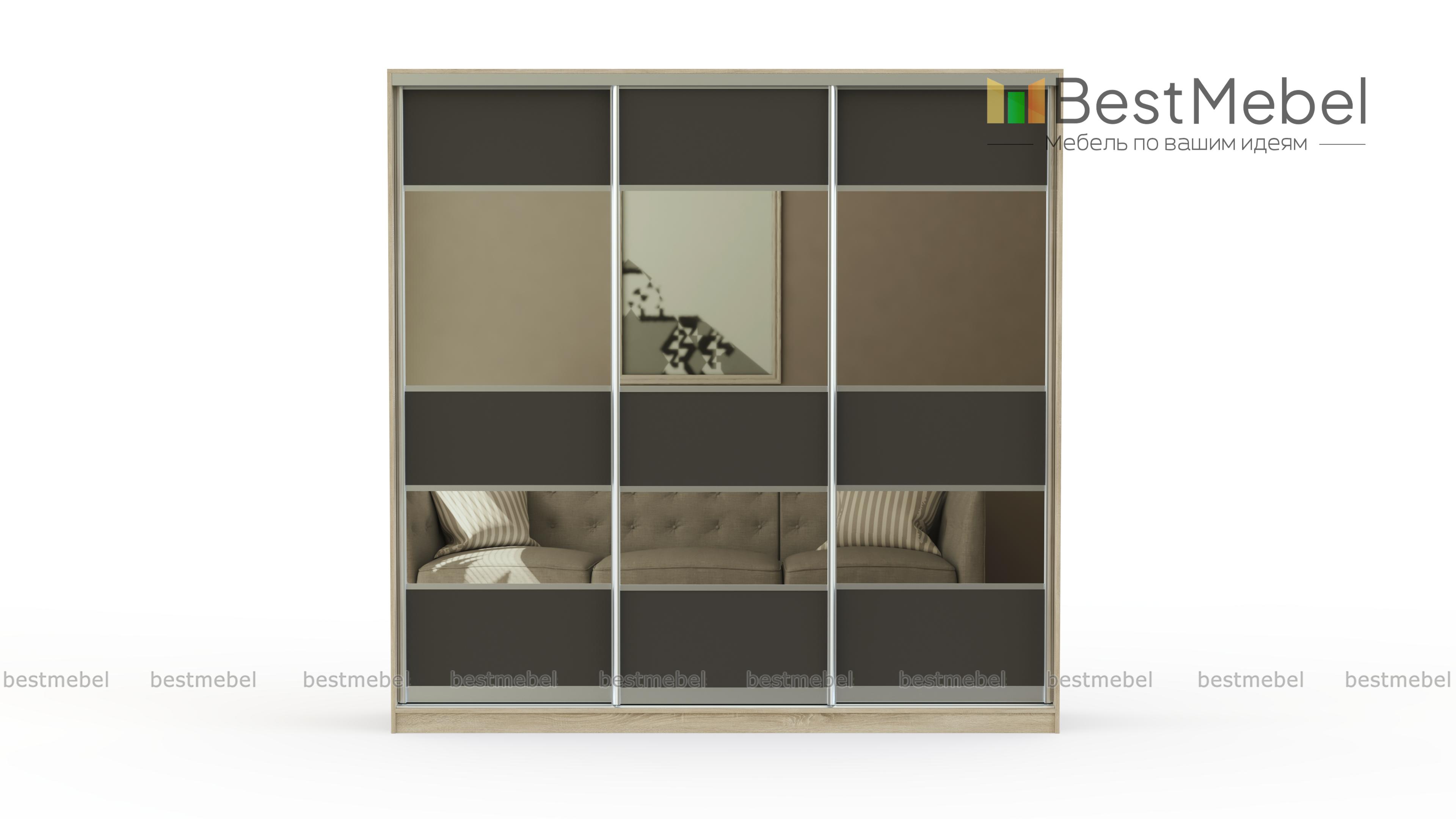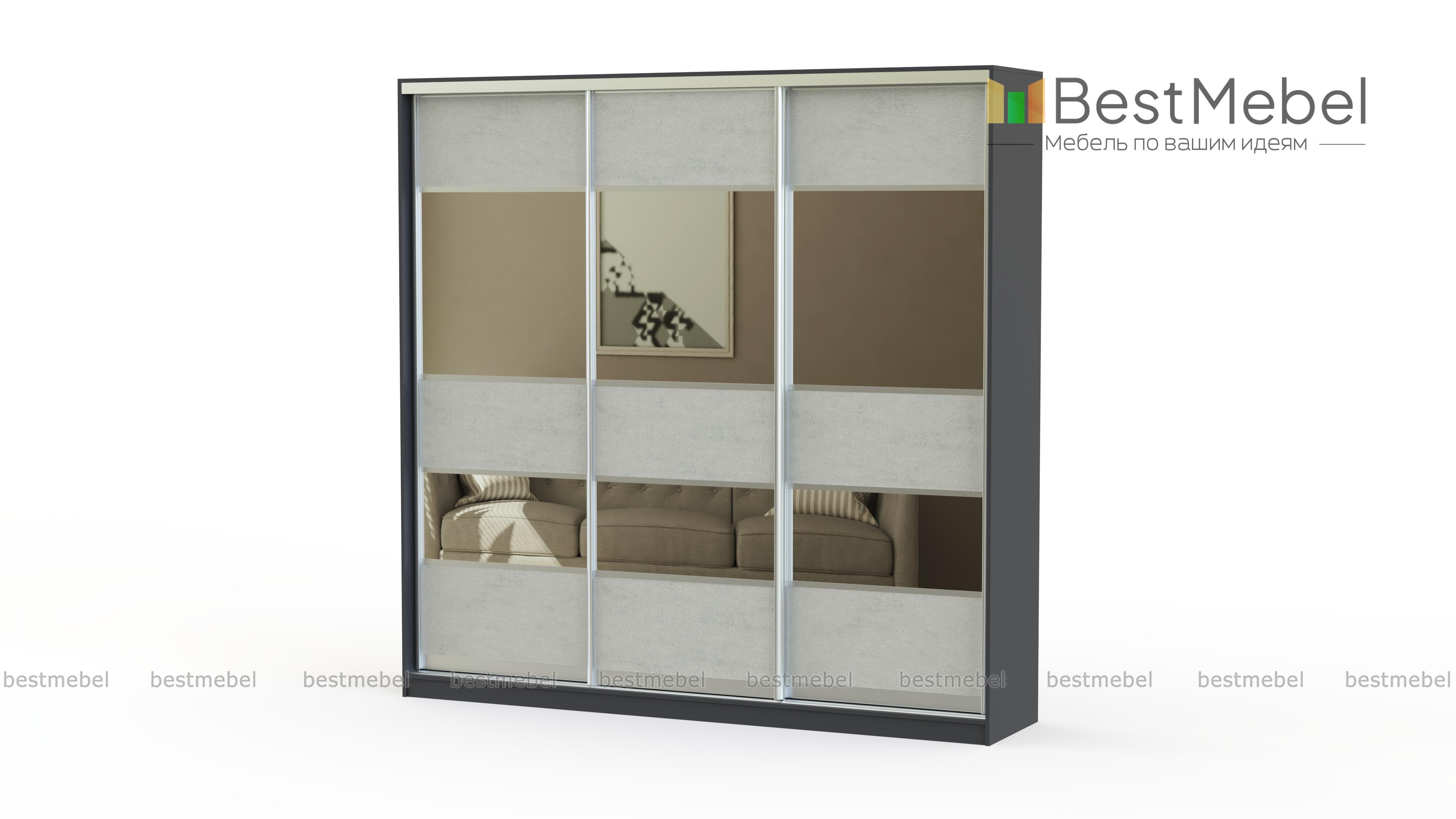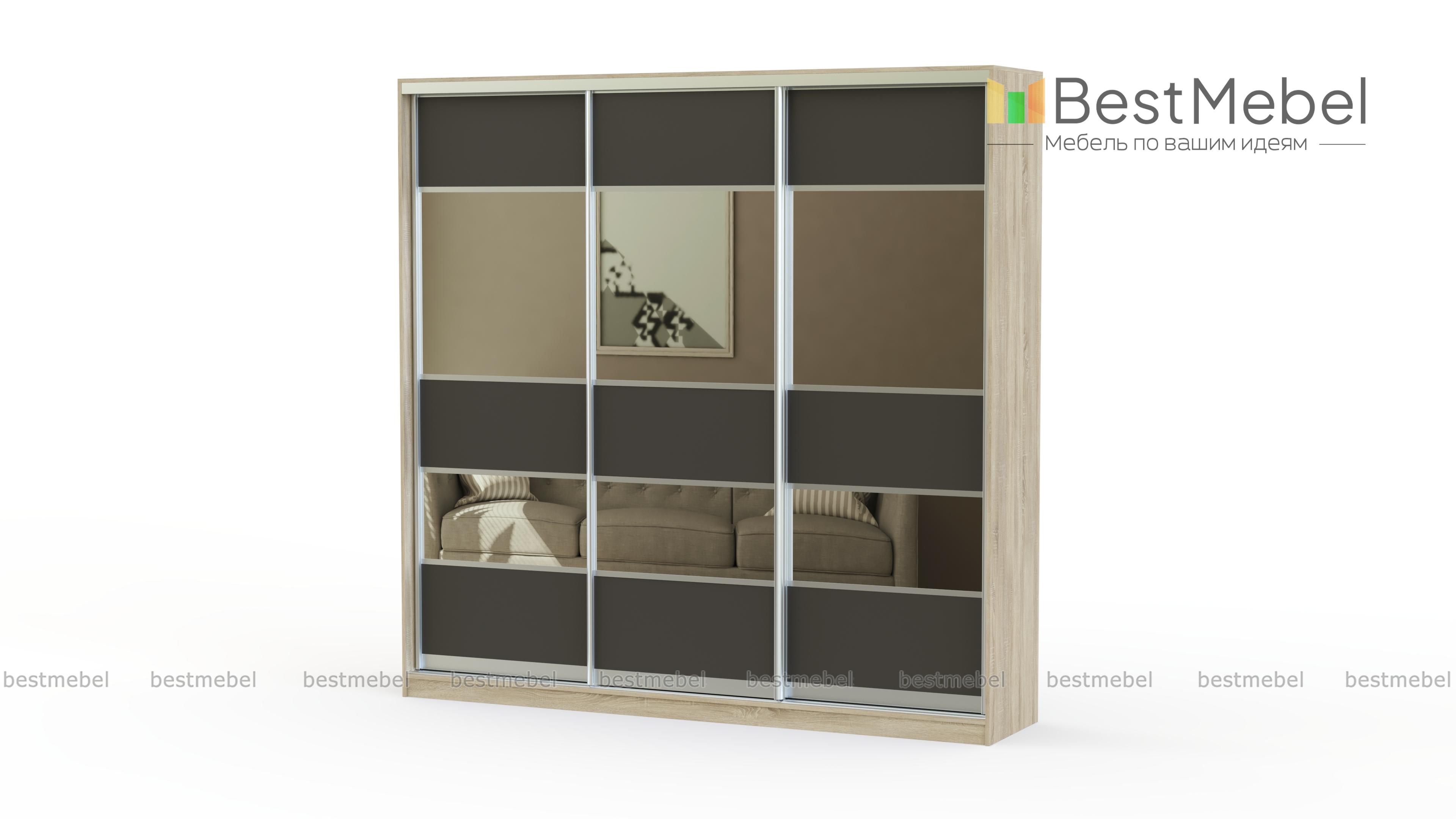 Красивый и стильный трёхдверный шкаф-купе с необычным комбинированным фасадом. Имеет достаточно вместительное внутреннее наполнение, в котором есть специальные отделения практически для всех видов одежды. Корпус, фасад и полки сделаны из качественного обработанного ДСП, который выдерживает даже значительные нагрузки. А хорошая фурнитура прекрасно дополняет общую картину.