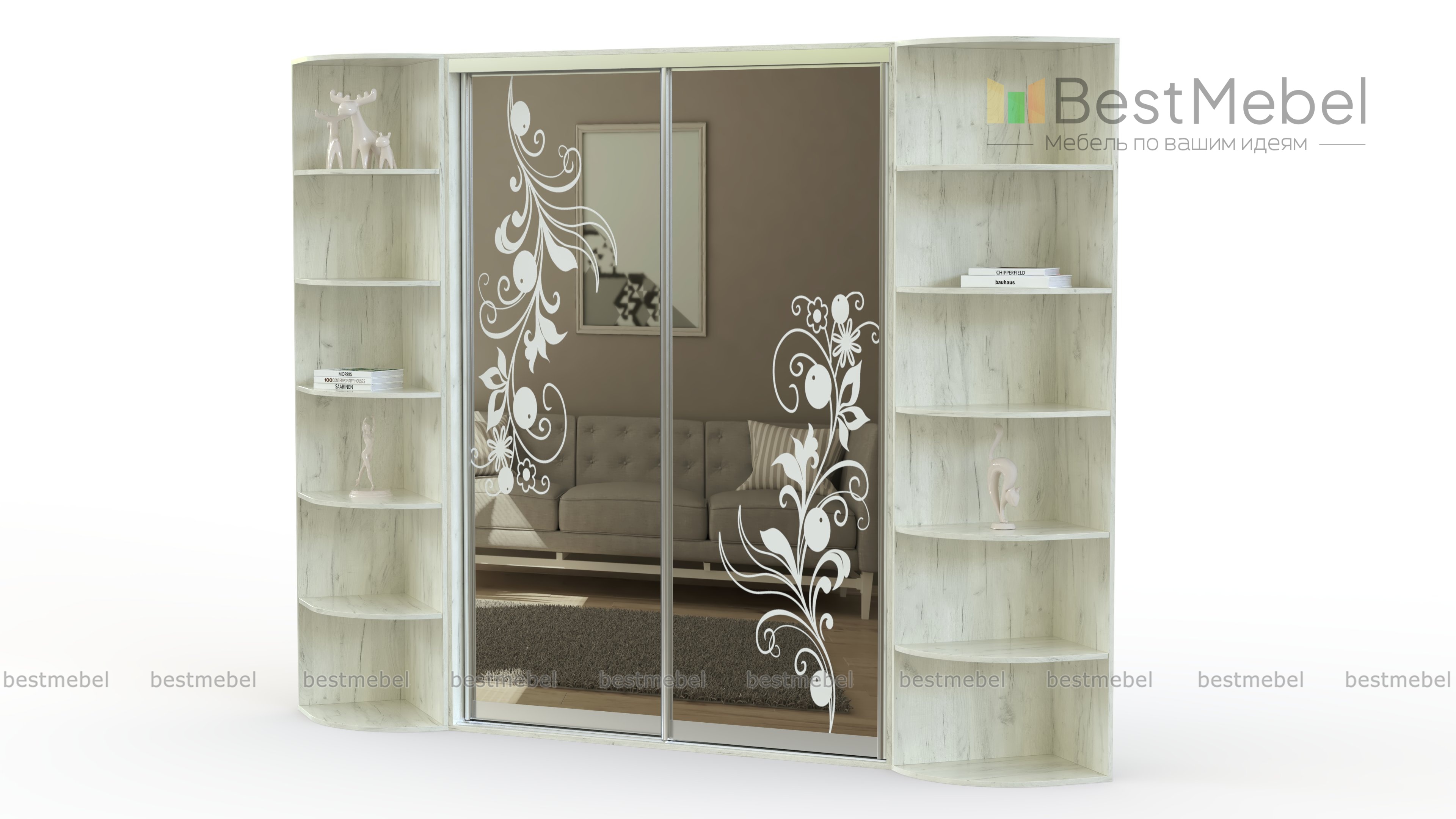 Угловой шкаф-купе Оскар-О BMS подойдет для помещения в стиле современной классики. Невесомый зеркальный фасад украшен фантазийным рисунком, а по бокам расположены объемные симметричные стеллажи под массив дерева. Конструкция шкафа позволяет задействовать угловое пространство комнаты и разместить как предметы гардероба, так и книги, аксессуары, важные мелочи и любимый декор. Купить угловой шкаф-купе Оскар-О BMS, изготовленный по вашим размерам, можно на сайте нашего интернет-магазина.