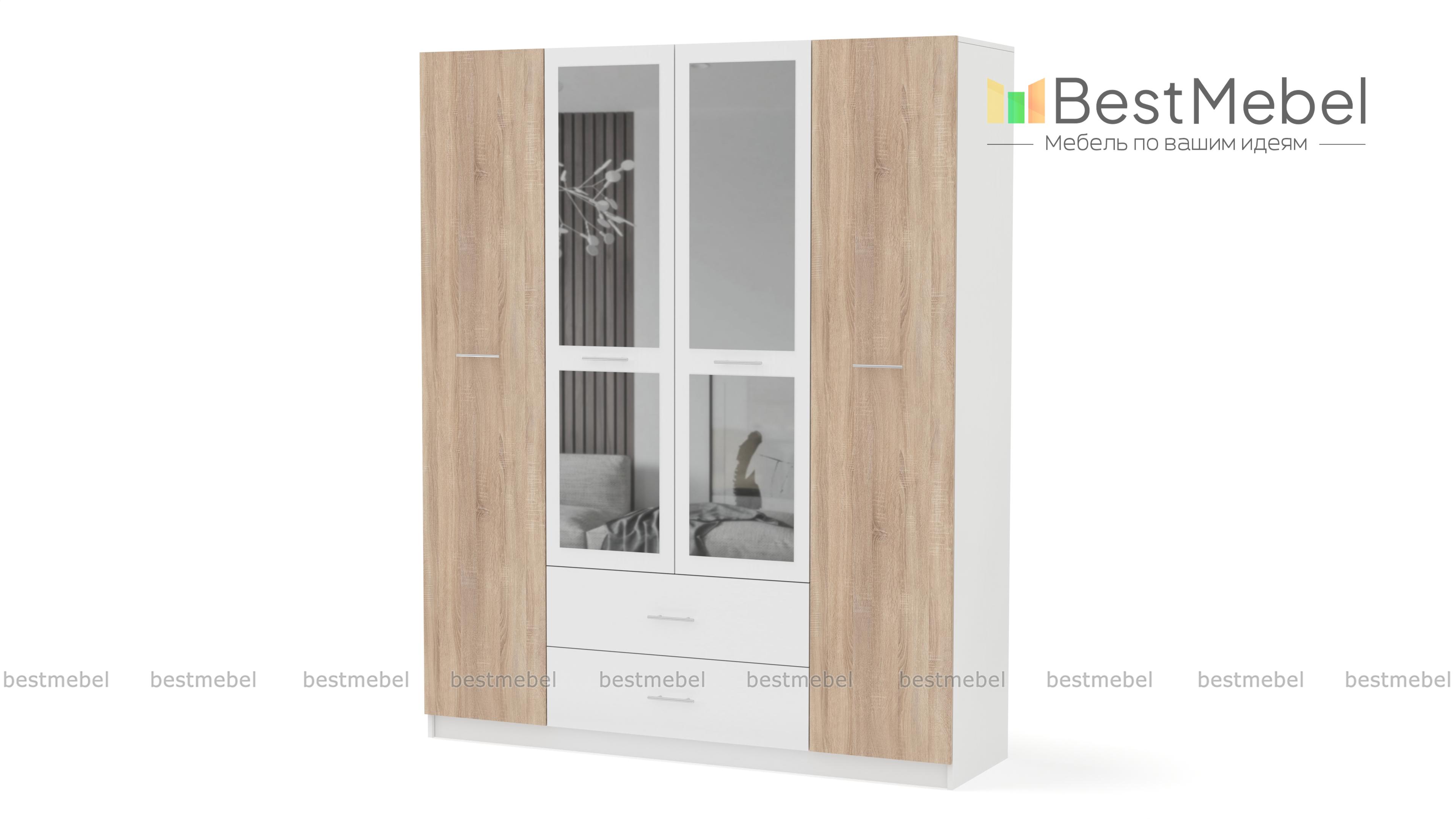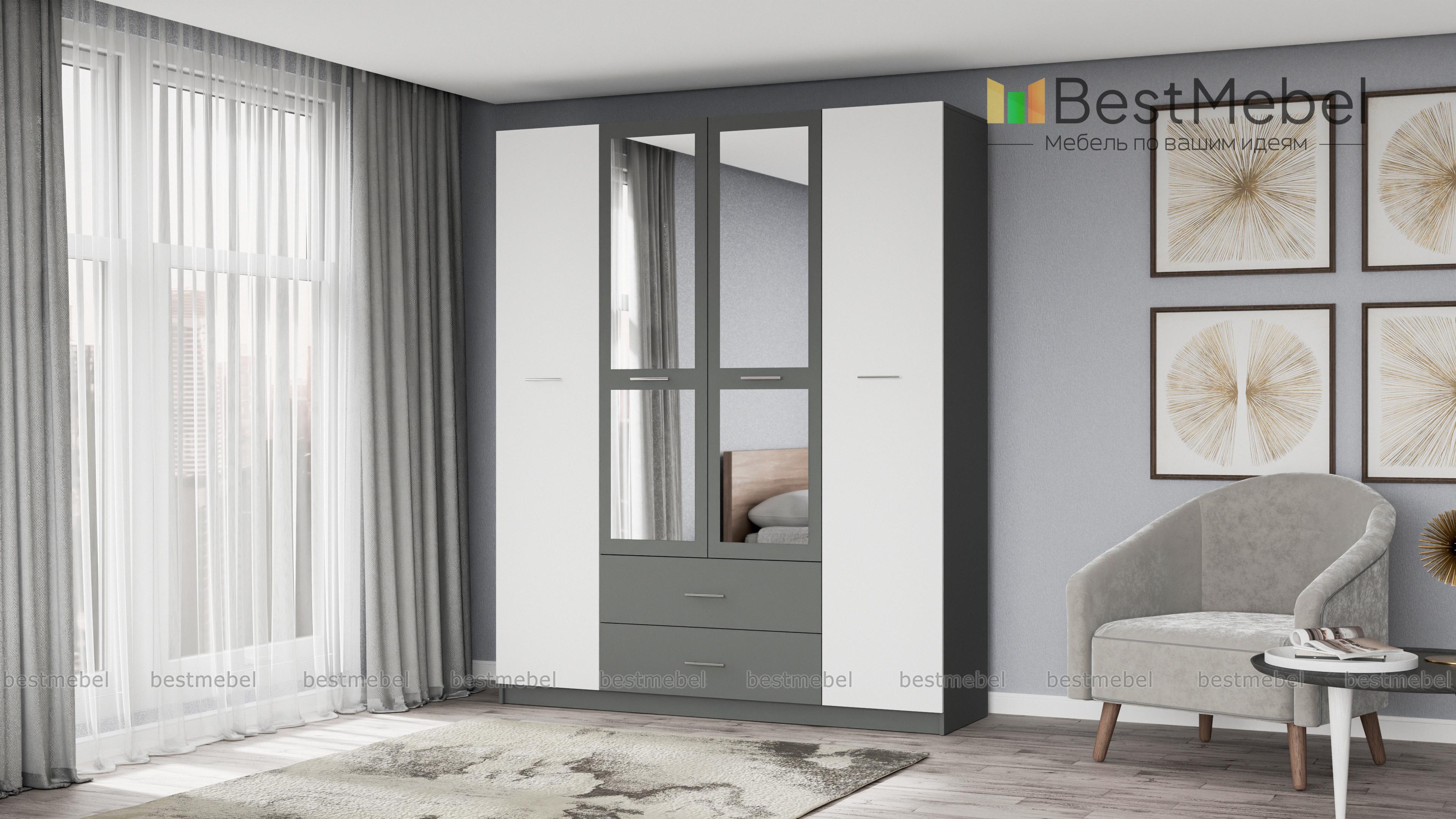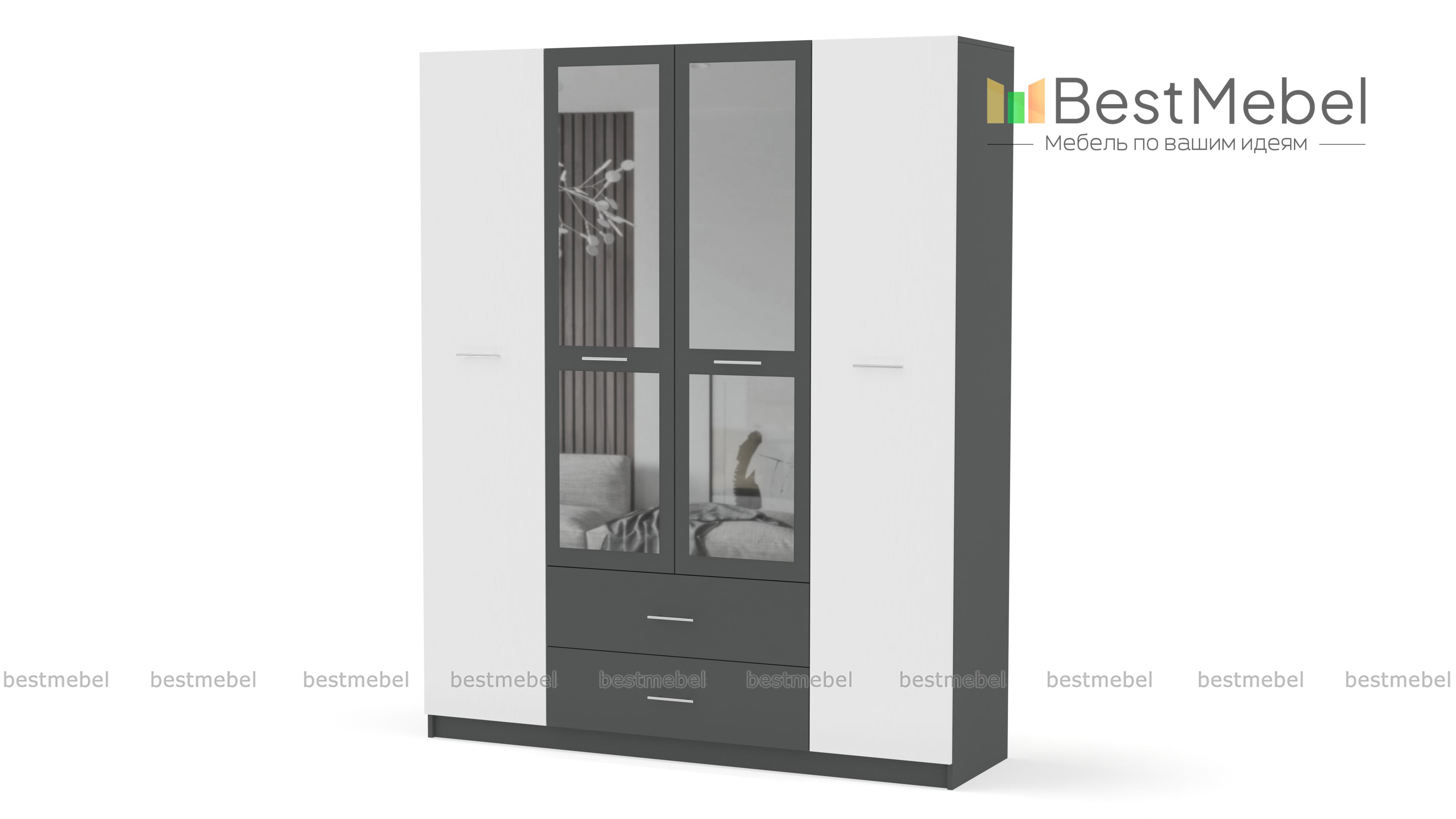 Шкаф Татьяна 4 BMS отличается вместительностью и выполнен в контрастной цветовой гамме, которая элегантно смотрится и в классическом, и в современном интерьере. За распашными дверцами располагаются антресольные полки, два отделения со штангами и секция с полками. В основании – два выдвижных ящика для мелких вещей. Оригинальные фасады декорированы зеркалами и ручками с контрастными вставками темного оттенка. Купить шкаф Татьяна 4 BMS по доступной цене вы сможете в нашем интернет-магазине.