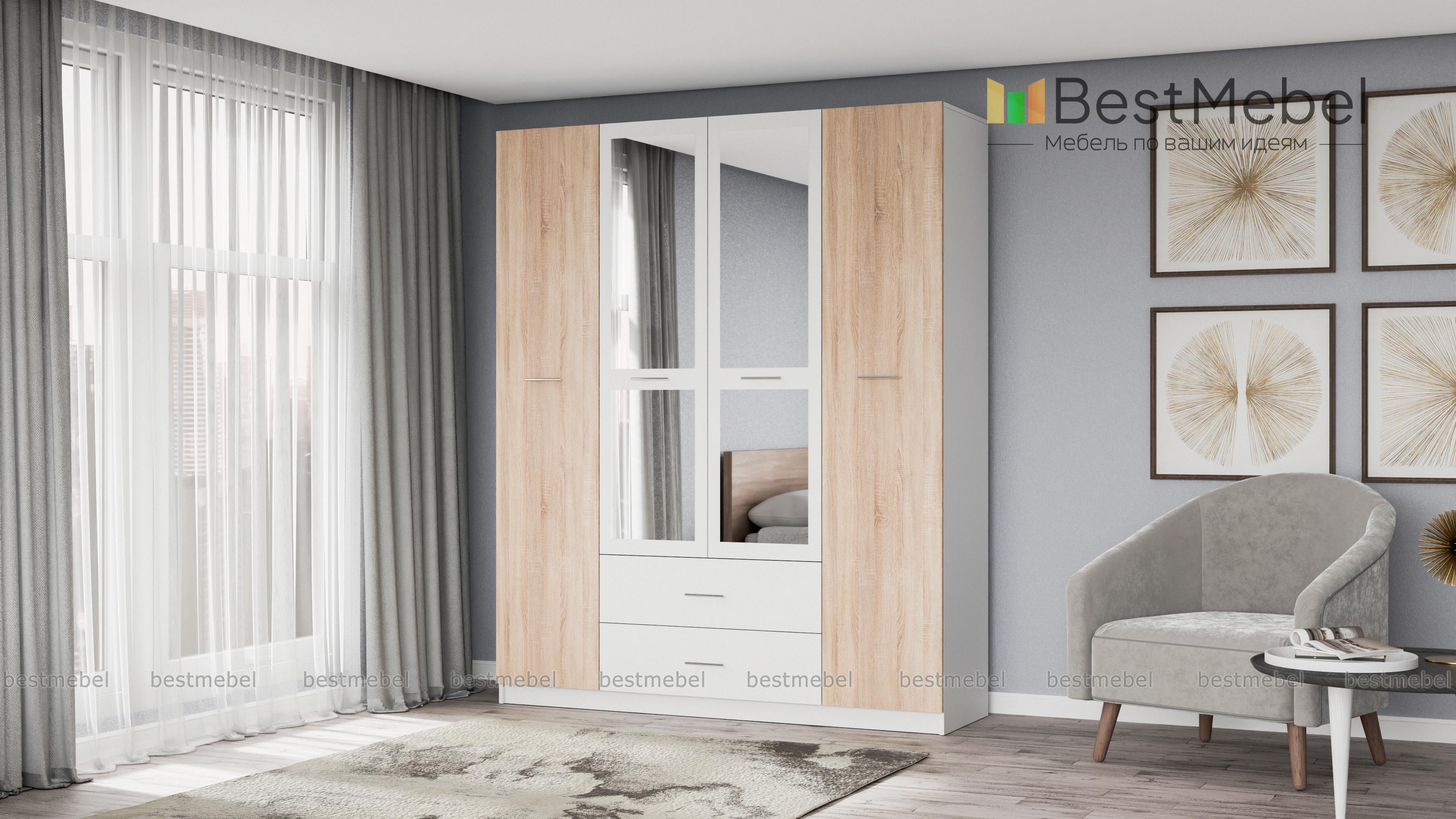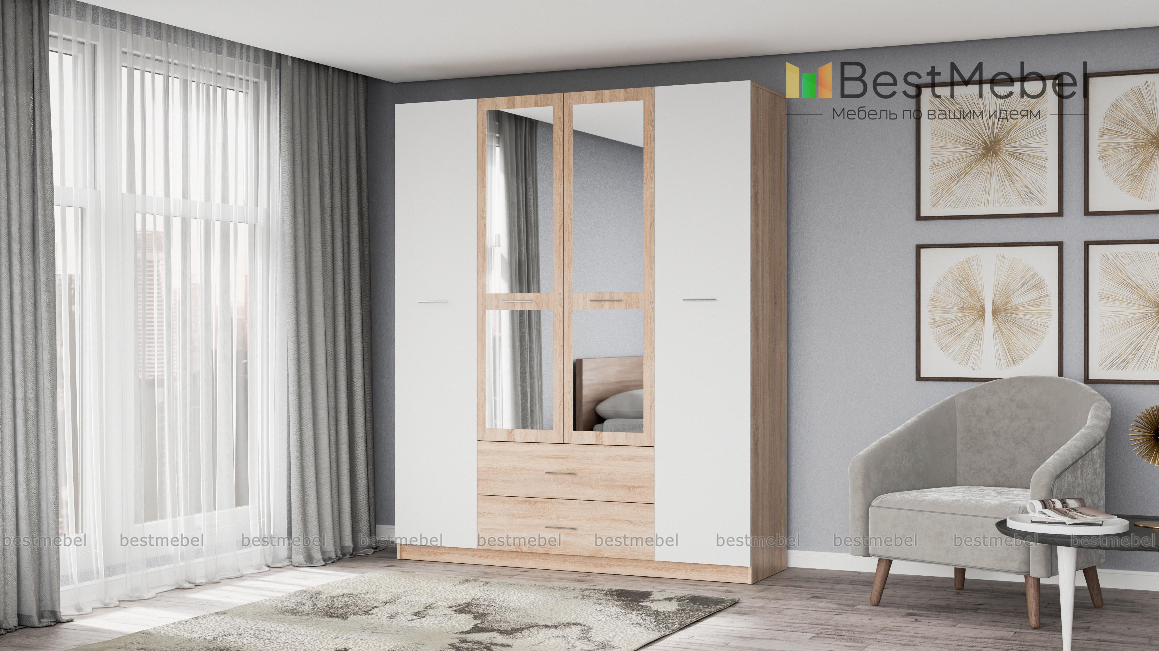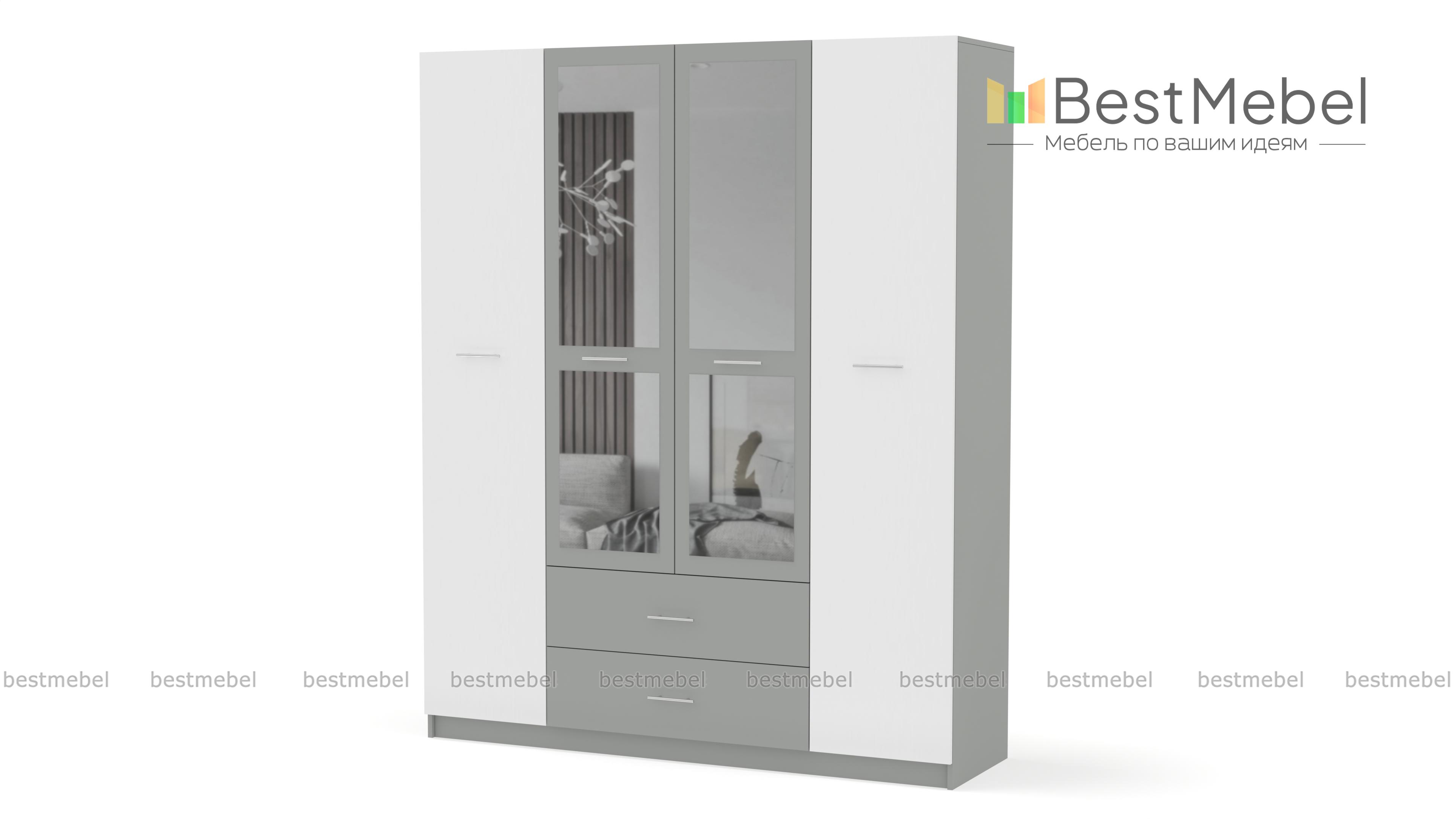 Шкаф Татьяна 4 BMS отличается вместительностью и выполнен в контрастной цветовой гамме, которая элегантно смотрится и в классическом, и в современном интерьере. За распашными дверцами располагаются антресольные полки, два отделения со штангами и секция с полками. В основании – два выдвижных ящика для мелких вещей. Оригинальные фасады декорированы зеркалами и ручками с контрастными вставками темного оттенка. Купить шкаф Татьяна 4 BMS по доступной цене вы сможете в нашем интернет-магазине.