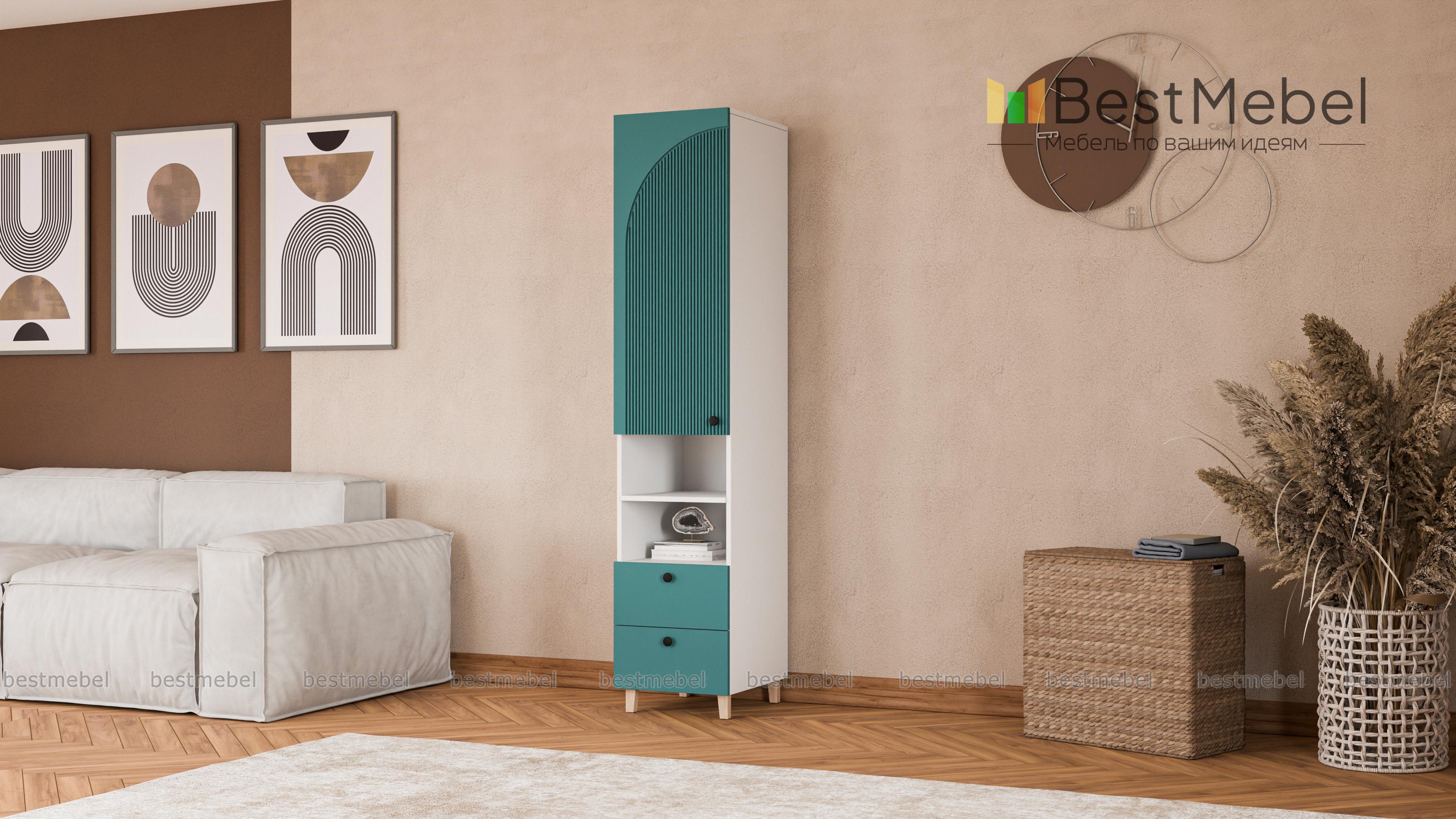 Шкаф-пенал Вивьен 5 BMS — небольшой и функциональный, отлично смотрится и в детской, и в гостиной. Древесного оттенка корпус с высокими ножками, изготовленный из ЛДСП, дополняет стильный фактурный фасад. Для удобного хранения конструкцией предусмотрены вместительное распашное отделение, ниша с полкой и два выдвижных ящика, расположенных снизу. Купить шкаф-пенал Вивьен 5 BMS с выбором размеров, цвета и фурнитуры вы сможете на сайте нашего интернет-магазина.