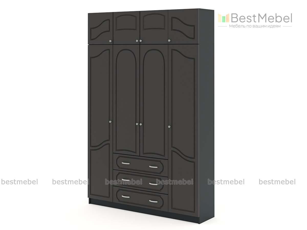 Шкаф Поларис 4.3А BMS отличается прекрасной вместительностью за счет продуманной системы хранения. Платяные и бельевые отделения четырехдверной модели дополнены тремя выдвижными ящиками и распашной антресолью для вещей, которыми вы редко пользуетесь. Особенную выразительность интерьеру спальни или прихожей придает оригинальная фрезеровка на темном фоне. Купить шкаф Поларис 4.3А BMS вы сможете в нашем интернет-магазине, по желанию изменив цвет и размеры.