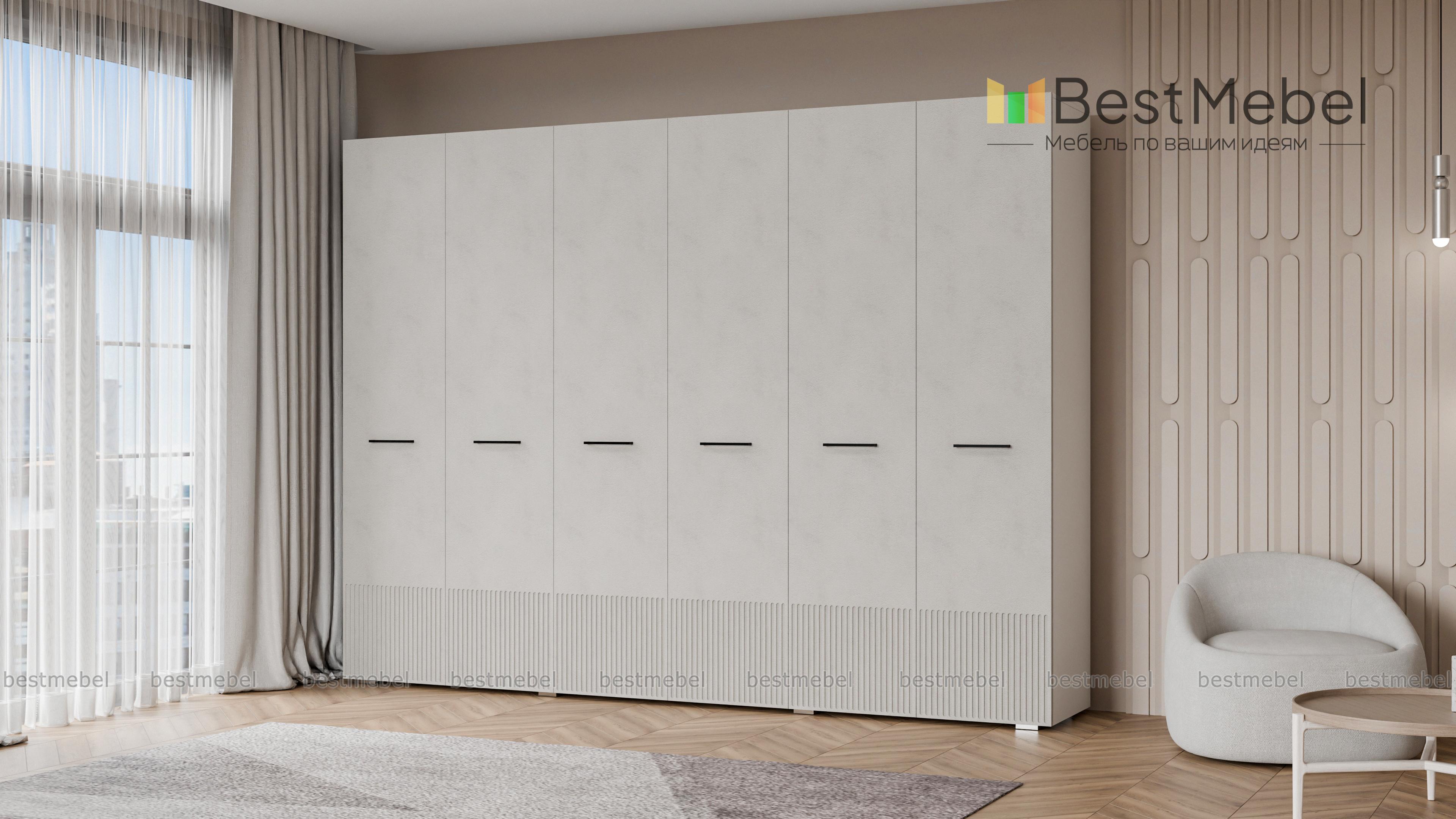 Шкаф распашной Декарт 6 BMS с шестью дверцами создан для хранения в просторных комнатах и обладает отличной вместительностью. Габариты шкафа скрадывает светлый оттенок, фрезеровка в нижней части фасада — практичное и стильное решение. Порядок в вашем гардеробе помогут легко поддерживать две центральные штанги и вместительные бельевые полки по бокам. Купить шкаф распашной Декарт 6 BMS, изготовленный по вашим размерам, приглашаем на сайт нашего интернет-магазина.