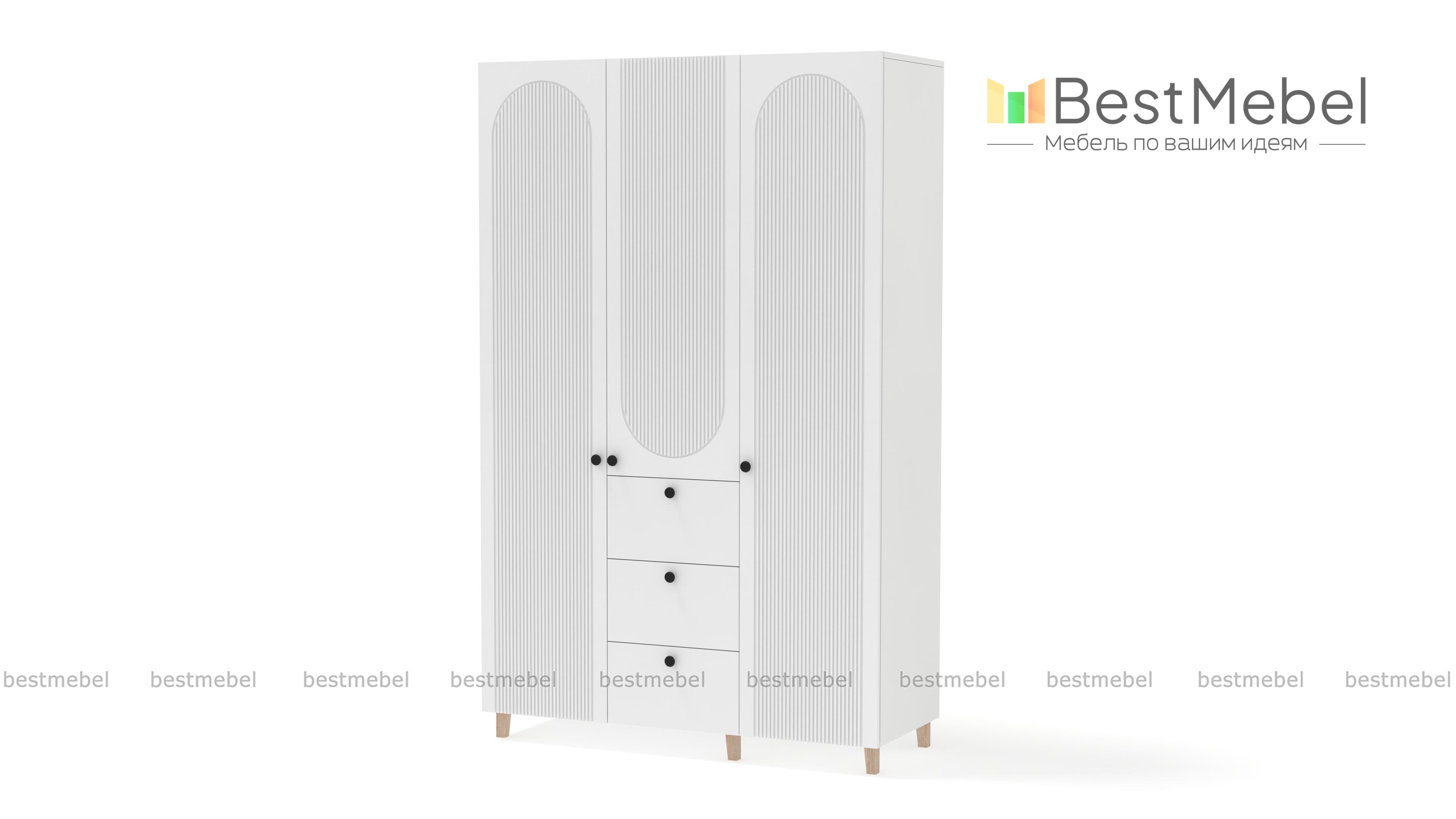 Шкаф распашной Рене 22 BMS с высокими ножками прекрасно подходит для меблировки спален, прихожих и гостиных. Помимо распашных отделений для белья и одежды трехдверный шкаф оборудован рядом из трех выдвижных ящиков, предназначенных для мелочей. На стильном темном фасаде из МДФ — оригинальный рельеф и миниатюрные круглые ручки. Купить шкаф распашной Рене 22 BMS в оттенках из нашего каталога и необходимом размере вы сможете недорого на сайте интернет-магазина.
