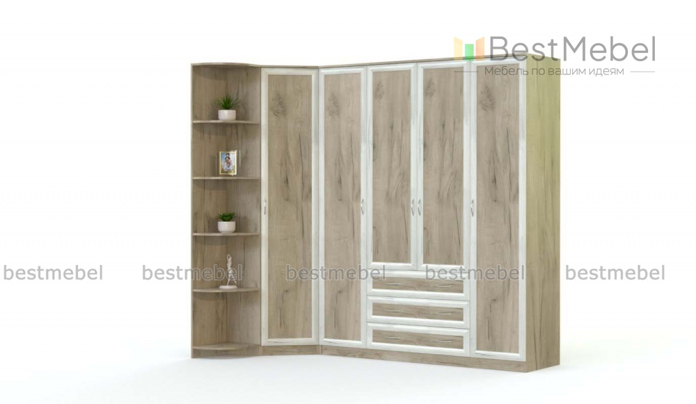 Шкаф угловой Волх 2 BMS поможет вам рационально организовать пространство и разместить большое количество вещей – от одежды и домашнего текстиля до декоративных мелочей. Композиция включает в себя угловой распашной модуль, прямой четырехдверный шкаф с тремя выдвижными ящиками и скругленный торцевой стеллаж. Актуальный вид классической модели с рамочными фасадами придает исполнение в крафтовых древесных тонах. Купить шкаф угловой Волх 2 BMS приглашаем в наш интернет-магазин с возможностью изменения цвета и размеров.