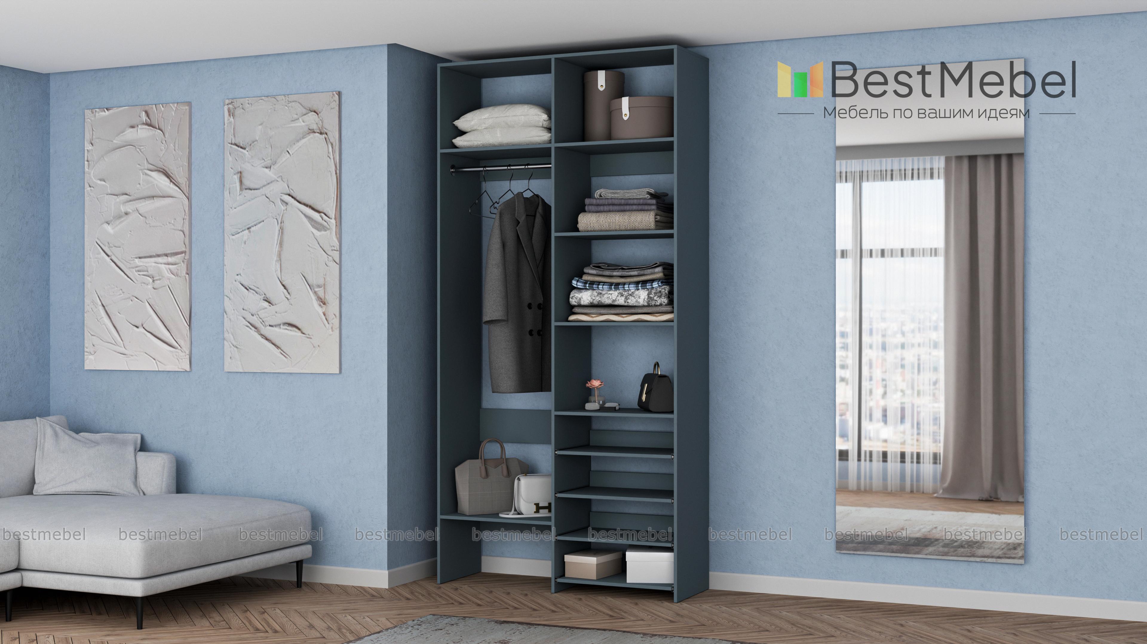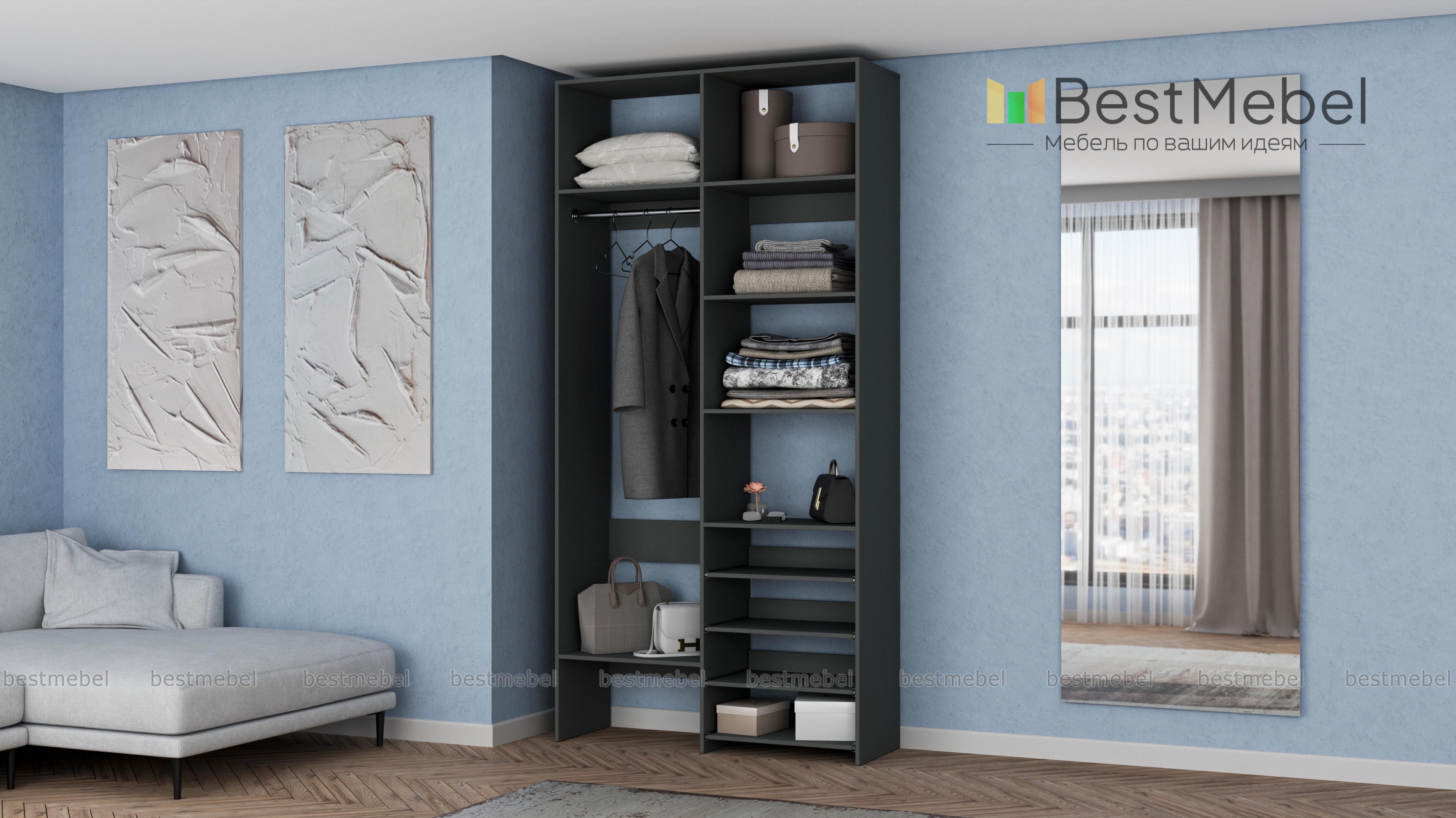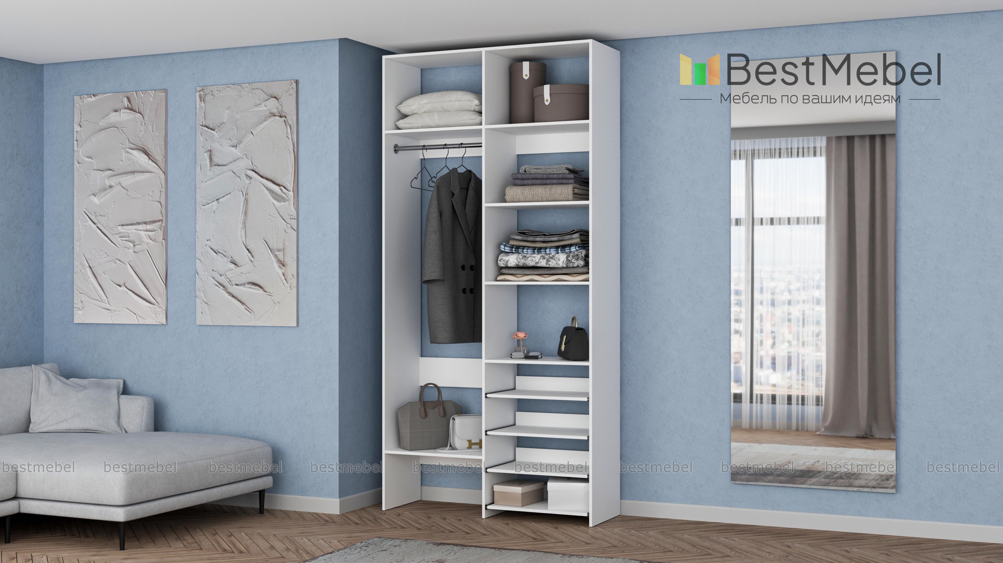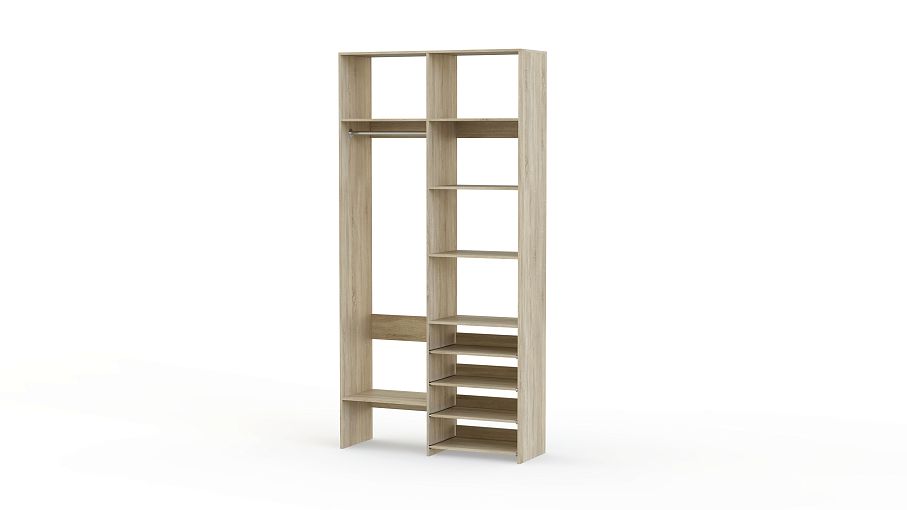 Стеллаж для одежды Мирта 79 BMS подойдет вам, если вещей немного. Компактная по ширине конструкция оборудована не только штангой для вешалок и стандартным набором бельевых полок, но и четырьмя выдвижными панелями. В нейтральном природном оттенке стеллаж выглядит современно, а простая форма хорошо вписывается в пространство. Купить стеллаж для одежды Мирта 79 BMS, изготовленный по индивидуальным размерам, вы всегда сможете на сайте нашего интернет-магазина.