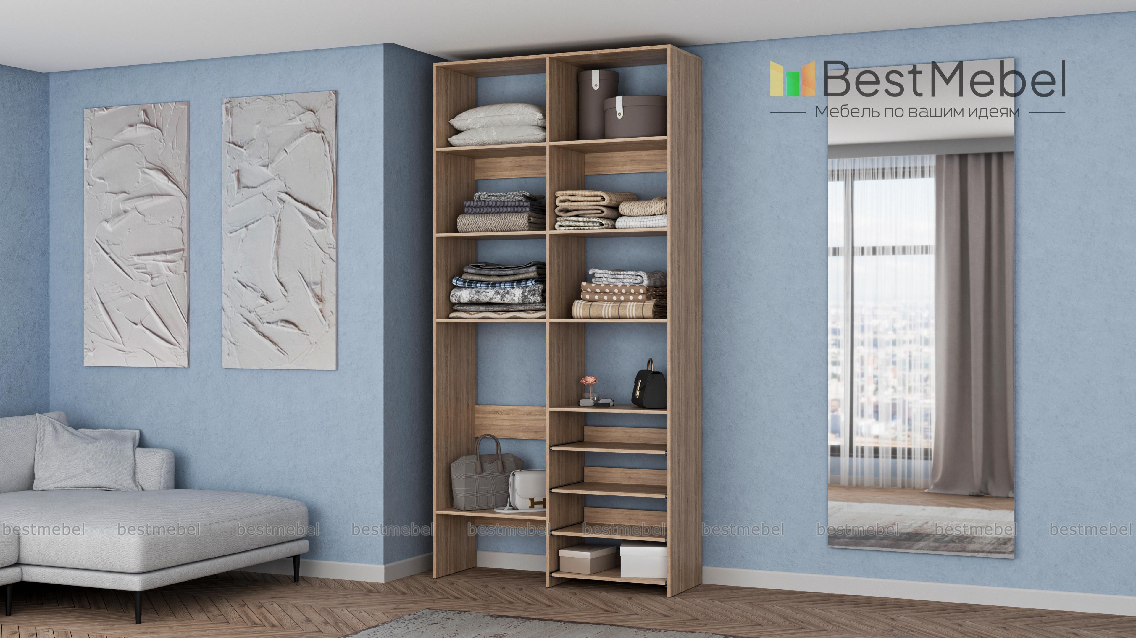 Стеллаж для одежды Мирта 80 BMS подойдет для комнат малого метража, где важна компактность. Модификация с открытыми секциями разных размеров и полками на направляющих оптимальна, если нужно хранить сложенную одежду, обувь, коробки и корзины с вещами. Базовый природный оттенок стеллажа и простая форма отлично смотрятся в любом современном интерьере. Купить стеллаж для одежды Мирта 80 BMS в необходимом размере и цвете вы сможете на сайте нашего интернет-магазина.