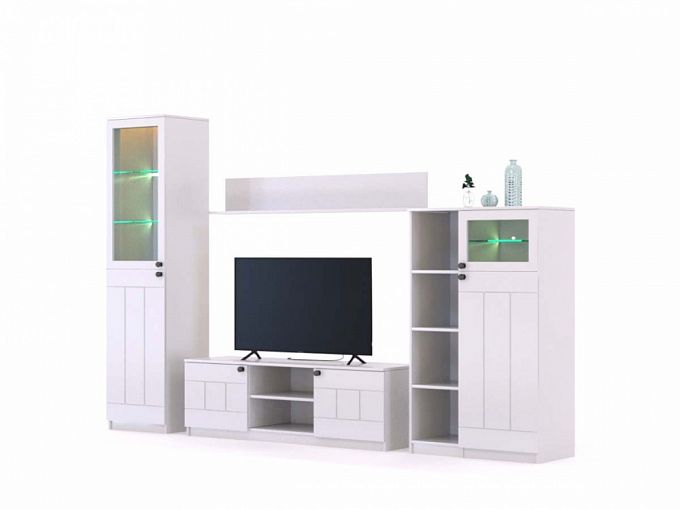 Стенка Асель 037 BMS – это практичный модульный набор для создания интерьеров в скандинавском стиле. Выполненные в универсальном белом цвете, предметы лаконичны и декорированы по фасаду вертикальной фрезеровкой. Композиция включает в себя широкую низкую тумбу с распашными отделениями и нишами под аппаратуру, комбинированную высокую тумбу со стеклянной вставкой, шкаф-витрину с подсветкой и навесную открытую полку. Купить стенку Асель 037 BMS для уютной современной гостиной приглашаем в наш интернет-магазин.