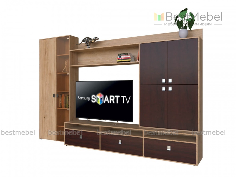 Стенка Гамлет 1 BMS выглядит уютно и актуально благодаря цветовому решению под массив дерева. Широкую низкую тумбу с нишами и выдвижными ящиками для аппаратуры и сопутствующих аксессуаров дополняют распашной шкаф с глухими фасадами, комбинированный со стеклянной дверцей и открытые полки. Оригинальная фурнитура придает дизайну особенную выразительность. Купить стенку Гамлет 1 BMS с возможностью изготовления по индивидуальным размерам приглашаем в наш интернет-магазин.