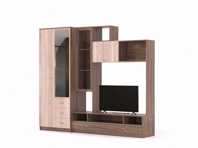 Стенка Силли 2 BMS оптимальна для небольших гостиных, где важна экономия пространства. Модель выполнена в нейтральных оттенках под древесный массив и отличается лаконичным и функциональным современным дизайном. Для оформления зоны ТВ и удобного размещения одежды, бытовых мелочей и декоративных предметов стенка оборудована широкой низкой тумбой с нишами, книжными полками, витриной и комбинированным с ящиками шкафом для одежды с зеркалом. Купить стенку Силли 2 BMS вы сможете недорого в нашем интернет-магазине.