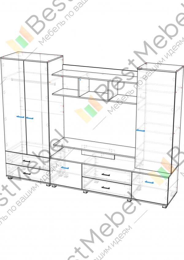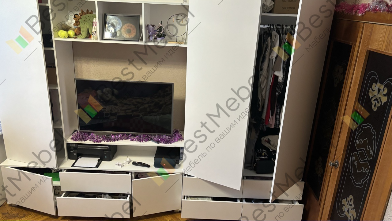 Спасибо магазину за очень быстрое изготовление и доставку стенки. Учли все пожелания, увеличили высоту тумбы, за счёт чего ящики стали более вместительными, и отпала необходимость в дополнительной подставке под ТВ, которая выглядит, на мой взгляд, не очень .. Из минусов, если без доплаты, то для задней стенки шкафов используют ДВП очень низкого качества, прям в лохмотьях, к тому же панели оказались немного узковаты, и на 2-3 мм не закрыли торцы ЛДСП, которые в том месте без кромки, к сожалению. На самой верхней панели были царапины, но их не видно там, поэтому претензии поедъявлять не стали. Учитывая скорость и возможность выполнить любую модель по индивидуальным размерам, магазин рекомендую. Отдельное спасибо за тумбочку в подарок. Будем заказывать здесь ещё.