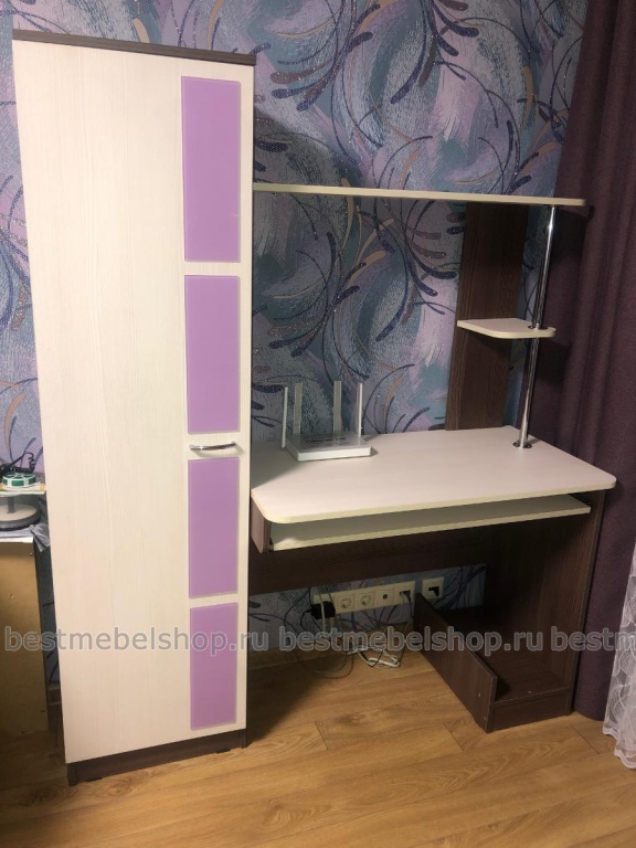 Организовать комфортное рабочее место поможет элегантный компьютерный стол №1 BMS. Гармоничные пропорции и контрастная расцветка подчеркнут все достоинства вашего интерьера. Модель оборудована столиком с компактной, со скругленными углами, столешницей, выдвижной полкой для клавиатуры и подставкой для системного блока. Канцелярские принадлежности удобно разместятся на открытых полках с металлическими опорами. Особенно стильный вид придает конструкции пенал с декорированным темными вставками фасадом.