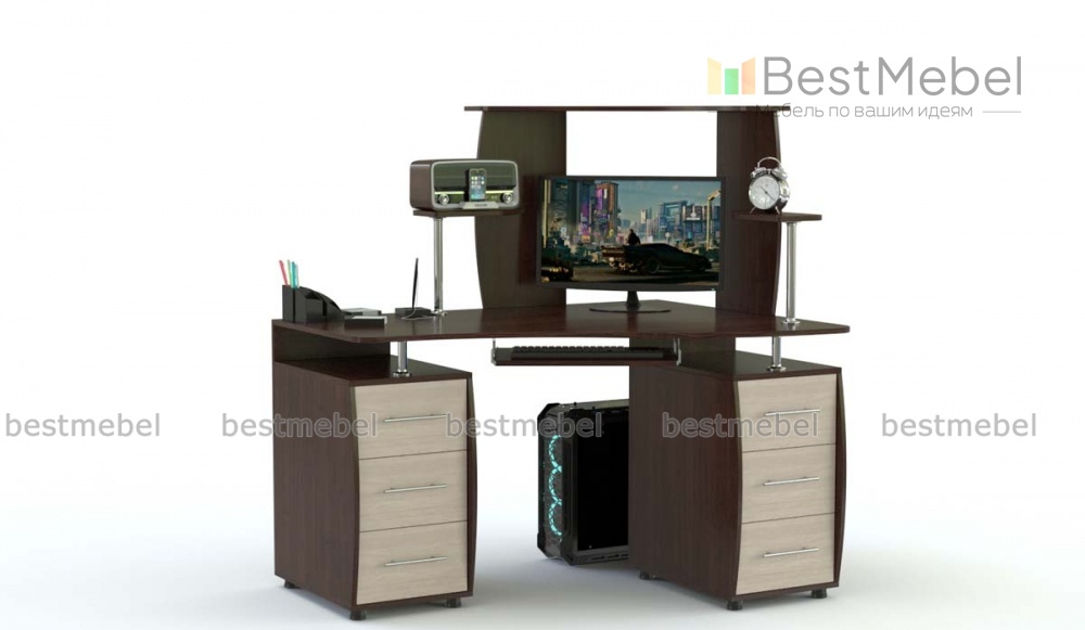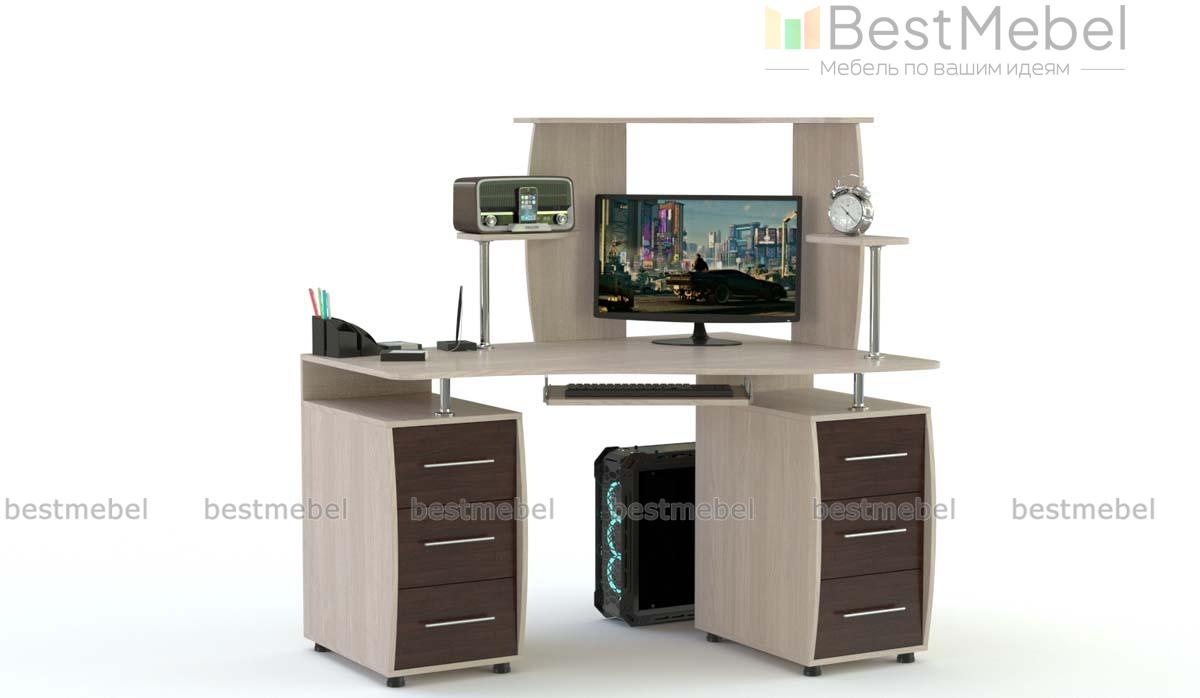 Угловой компьютерный стол КС-12У 2Я BMS поможет рационально организовать пространство, разместив все необходимое для работы или учебы. Плавно вырезанная столешница опирается на две тумбы, для монитора и периферийных устройств предусмотрена надстройка с открытыми полками. Стильными акцентами в лаконичном дизайне станут полукруглые вырезы боковин и хромированные детали. Купить угловой компьютерный стол КС-12У 2Я BMS приглашаем в наш интернет-магазин с возможностью выбора цвета и габаритов.