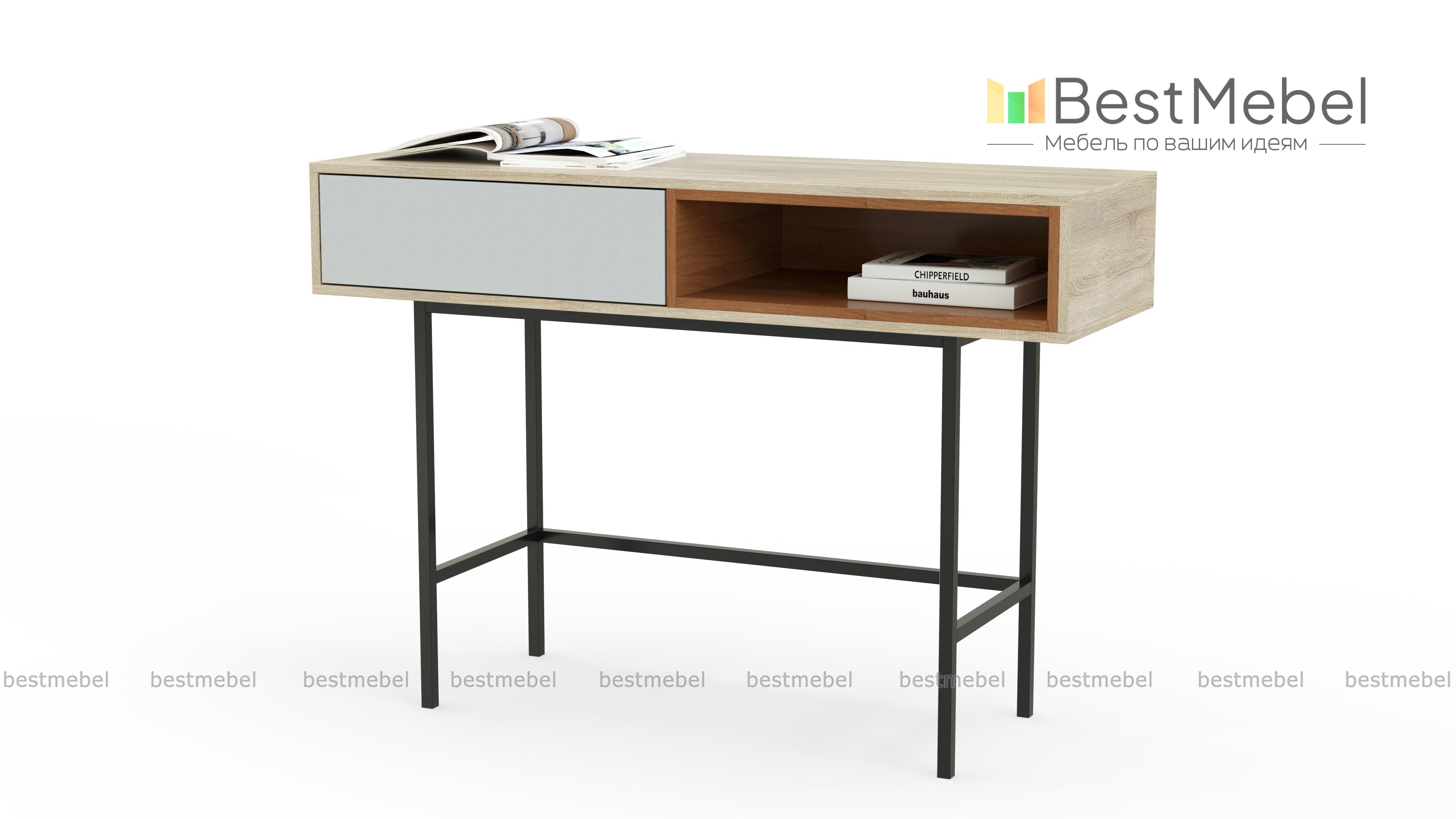 Стол консольный Николь 11 BMS выполнен в стиле минимализма, сочетая в себе строгие линии и монохромные оттенки. Под прямоугольной столешницей располагаются выдвижной ящик для хранения мелочей и выделенная контрастным цветом ниша под книги и бумаги. Особенно изящный вид конструкции придает легкий и прочный каркас из металлического профиля. Купить стол консольный Николь 11 BMS вы сможете в нашем интернет-магазине с индивидуальным подбором цвета и размеров.