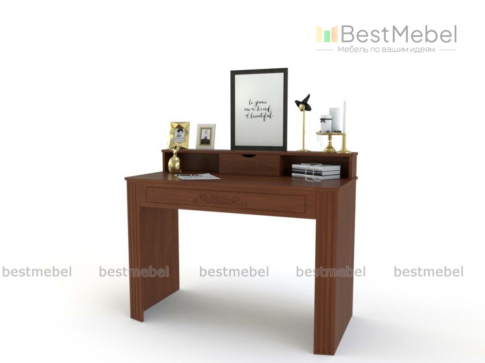 Трюмо Жаклин Д-11 BMS выполнено в теплых древесных тонах и украшено по фасаду изящной фрезеровкой. Модель гармонично дополнит интерьер спальни в классическом стиле и сделает уход за собой комфортным. Трюмо оборудовано просторной столешницей с выдвижным ящиком для мелочей и надстройкой, оборудованной нишами и миниатюрным ящичком. Устойчивость конструкции обеспечивают широкие боковины с накладками. Купить трюмо Жаклин Д-11 BMS вы сможете по выгодной цене в нашем интернет-магазине.