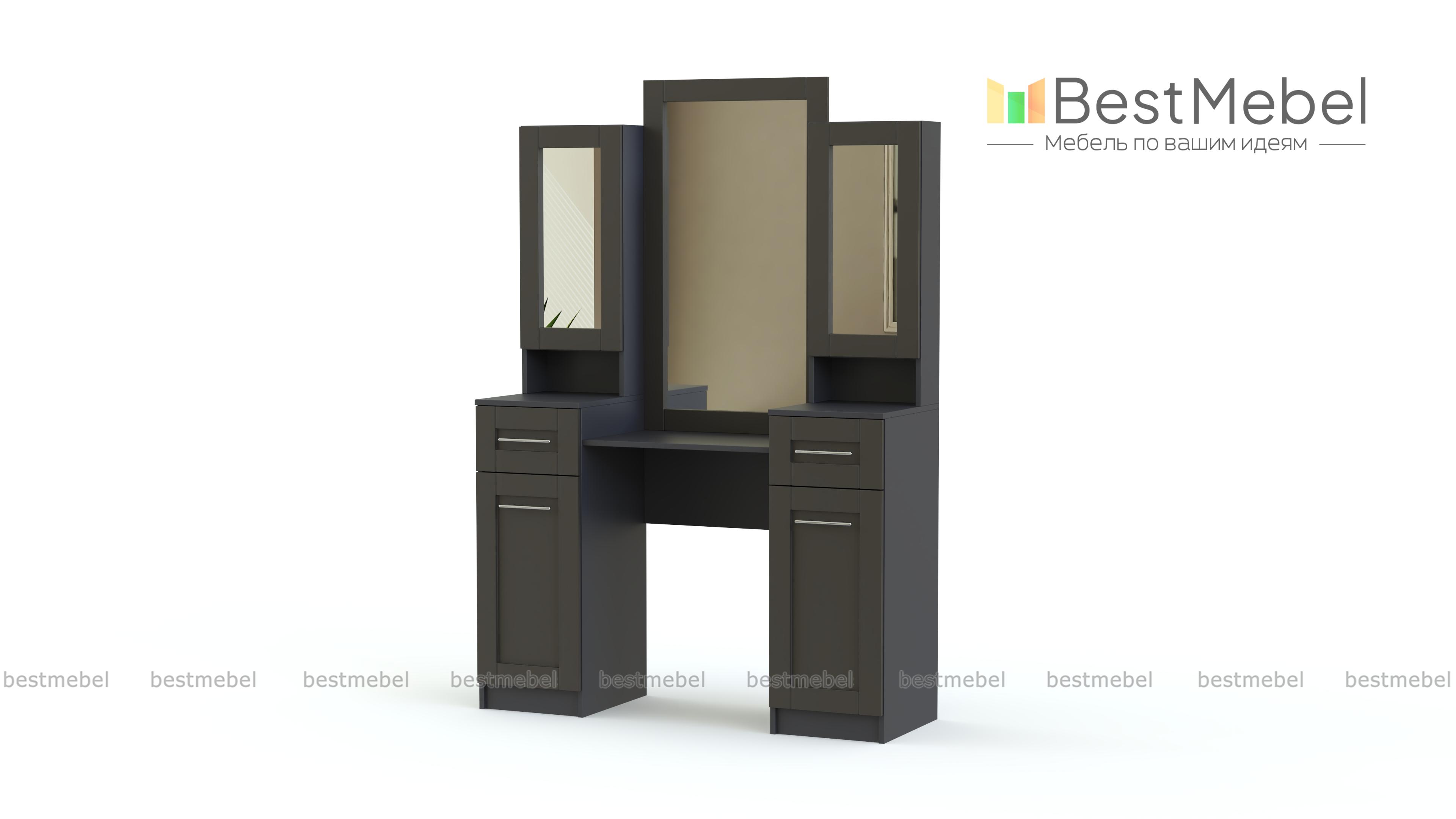Туалетный стол Гаурон №1.1 BMS благодаря продуманной и вместительной конструкции поможет расположить максимальное количество всех необходимых уходовых средств, косметики и других предметов первой необходимости в одном месте. За двумя зеркальными фасадами скрыты отделения с полками, а сами распашные отделения позволяют использовать модель как трюмо. Изделие оборудовано двумя выдвижными ящиками для хранения мелочей и двумя распашными отделениями с глухими фасадами. Износостойкие и долговечные материалы сохранят эстетичный вид модели на долгое время использования. Купить туалетный стол Гаурон №1.1 BMS, подобрав необходимые размеры, приглашаем в наш интернет-магазин.