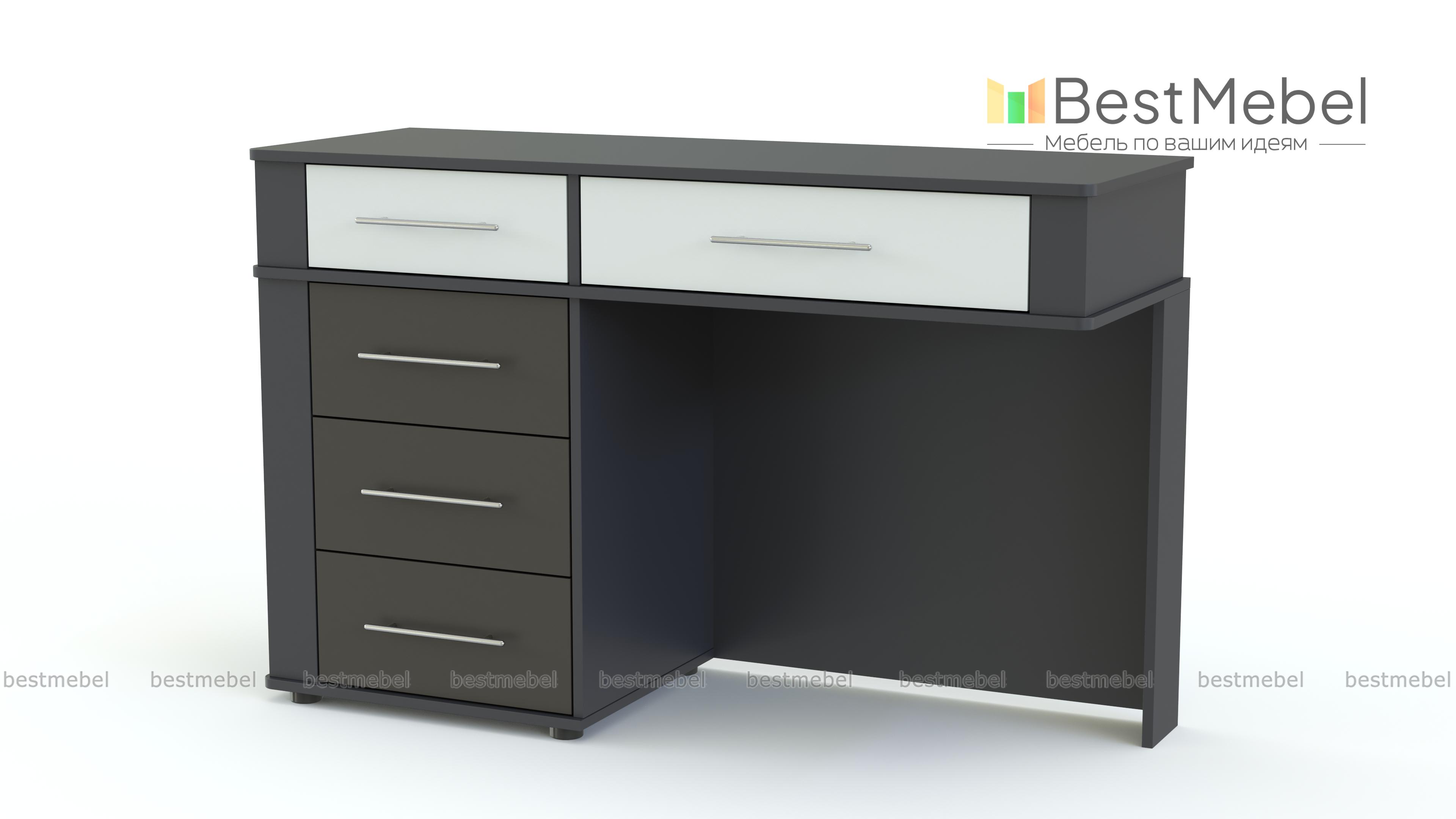 Туалетный столик Бруна BMS – это оригинальный дизайн и универсальная расцветка под массив дерева, которая гармонично впишется в большинство современных интерьеров. Модель отличается вместительностью и эргономичной формой, которые сделают уход за собой максимально комфортным. Столик оборудован просторной столешницей, двумя малыми и тремя большими выдвижными ящиками для мелочей с ручками-рейлингами, углы безопасно закруглены. Купить туалетный столик Бруна BMS для стильной и уютной спальни приглашаем по лучшей цене в наш интернет-магазин.