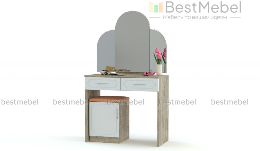 Туалетный столик Золушка BMS станет украшением спальни в классическом стиле. Прямой столик с трехстворчатым, фигурно вырезанным зеркалом, дополнен многофункциональной тумбой с мягким сиденьем, которая играет роль пуфа. Белоснежные фасады двух выдвижных ящиков и тумбы декорированы изящной рамочной фрезеровкой, эффектно сочетаясь с натуральными оттенками корпуса. Купить туалетный столик Золушка BMS для комфортного ухода за собой вы сможете в нашем интернет-магазине.